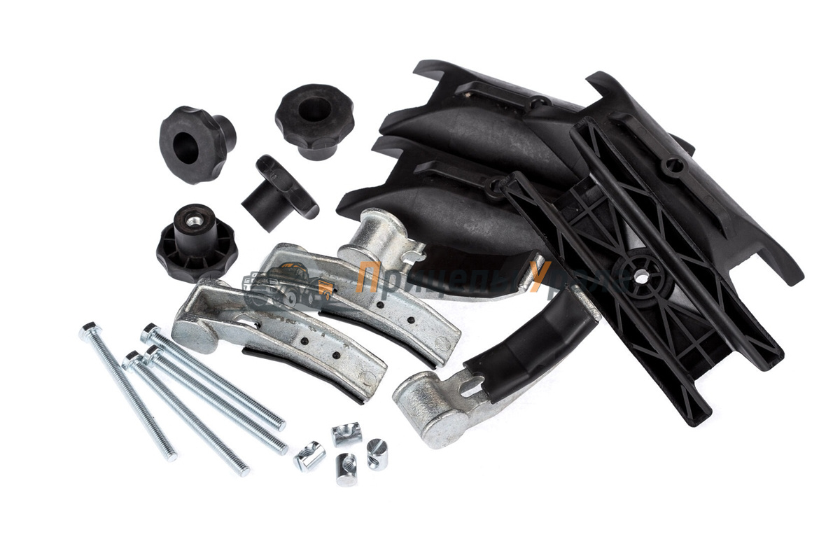 Комплект крепления для автомобильных боксов-багажников с местом крепления, имеющим возможность перемещения по продольной оси самого крепления. Простая и надежная система захвата: металлическая лапа, момент затяжки которой обеспечивает один барашек крепления - быстрое крепление и снятие автобокса с поперечин багажника. В опоре крепления предусмотрены скобы для установки грузовых ремней