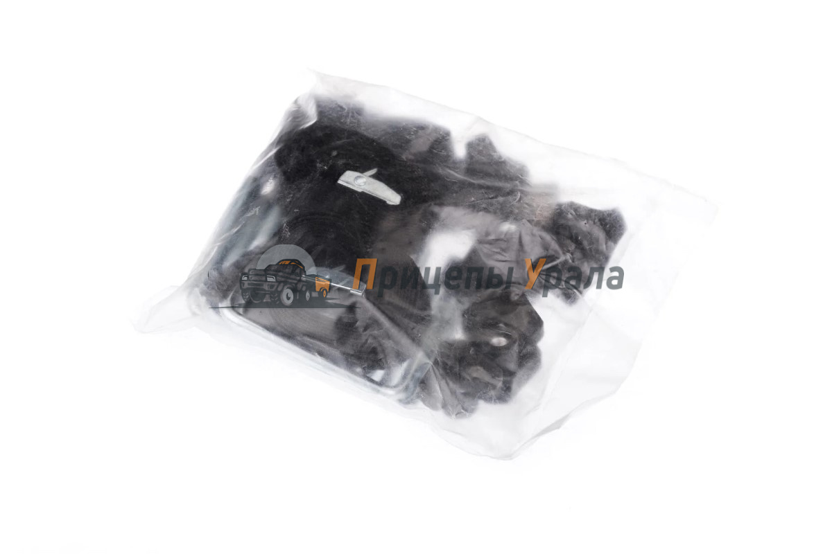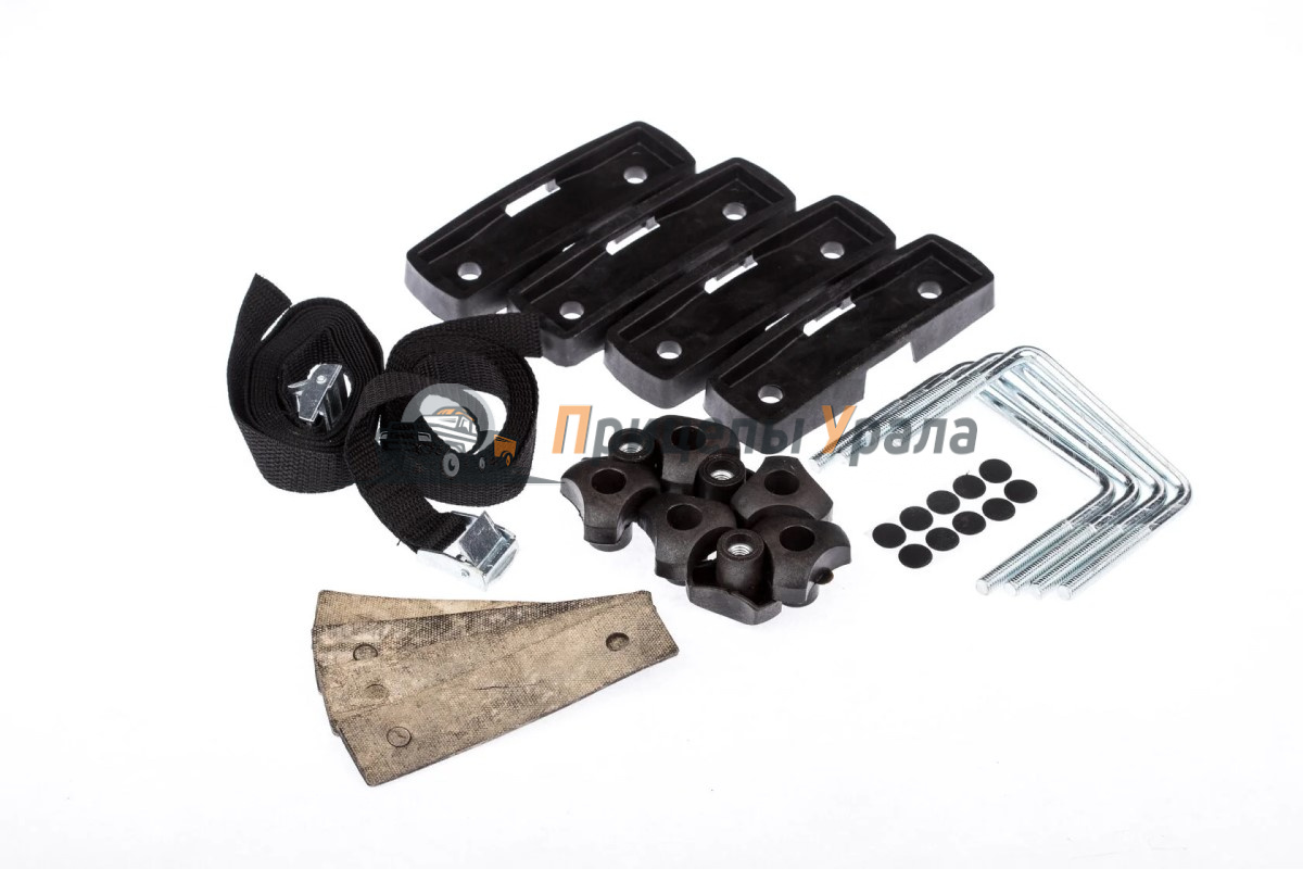 Стандартный установочный комплект автомобильного бокса. Скоба - межцентровое расстояние 90 мм., высота скобы (резьбовой части) - 70 мм. В комплекте 4 скобы, 4 резиновых уплотнителя, 4 пластиковые опоры с проушинами для ремня, 8 барашков и 2 грузовых ремня