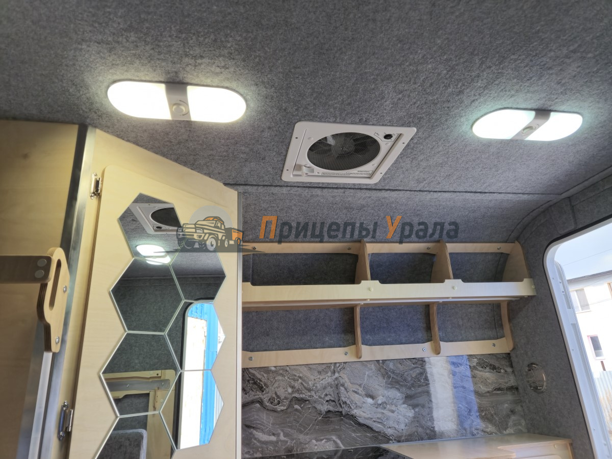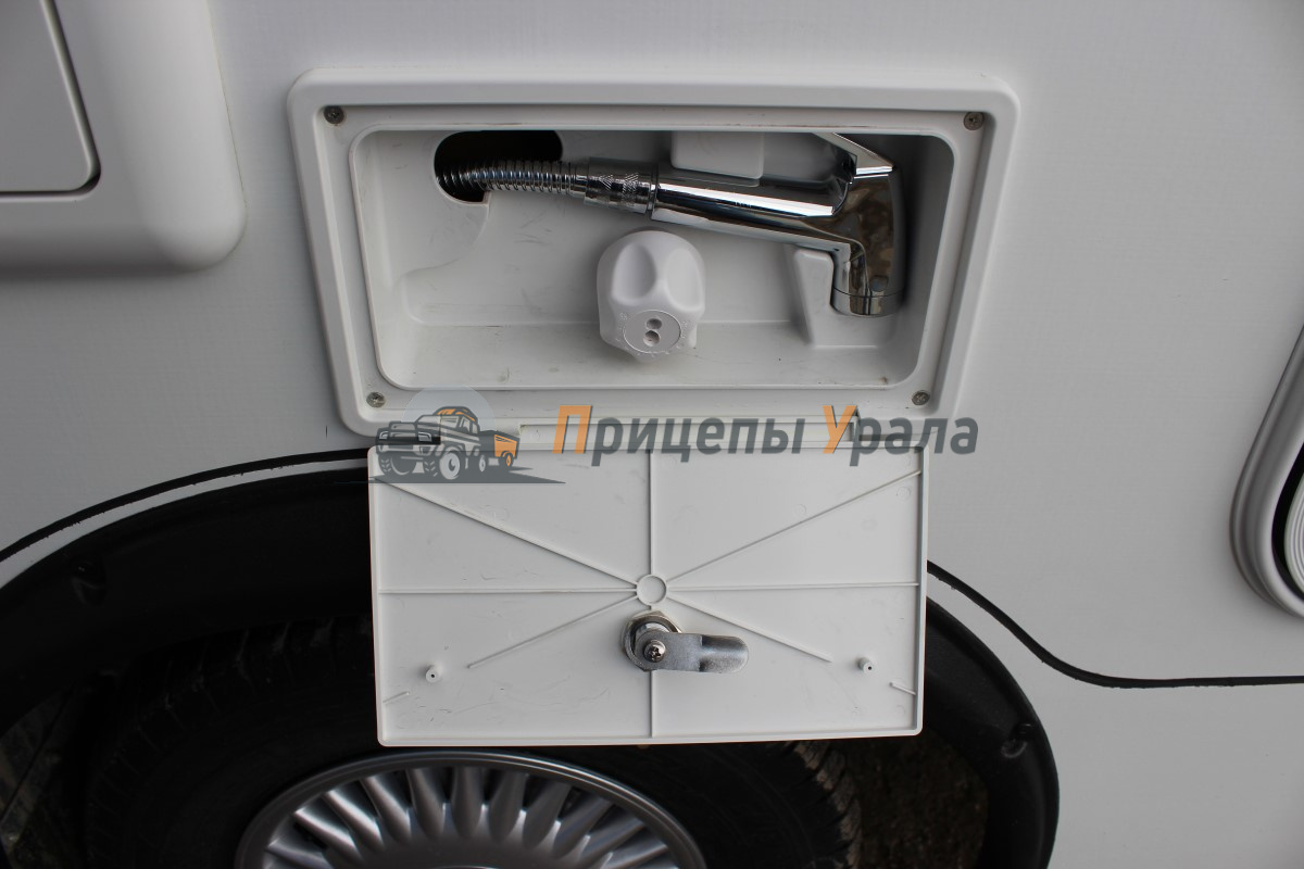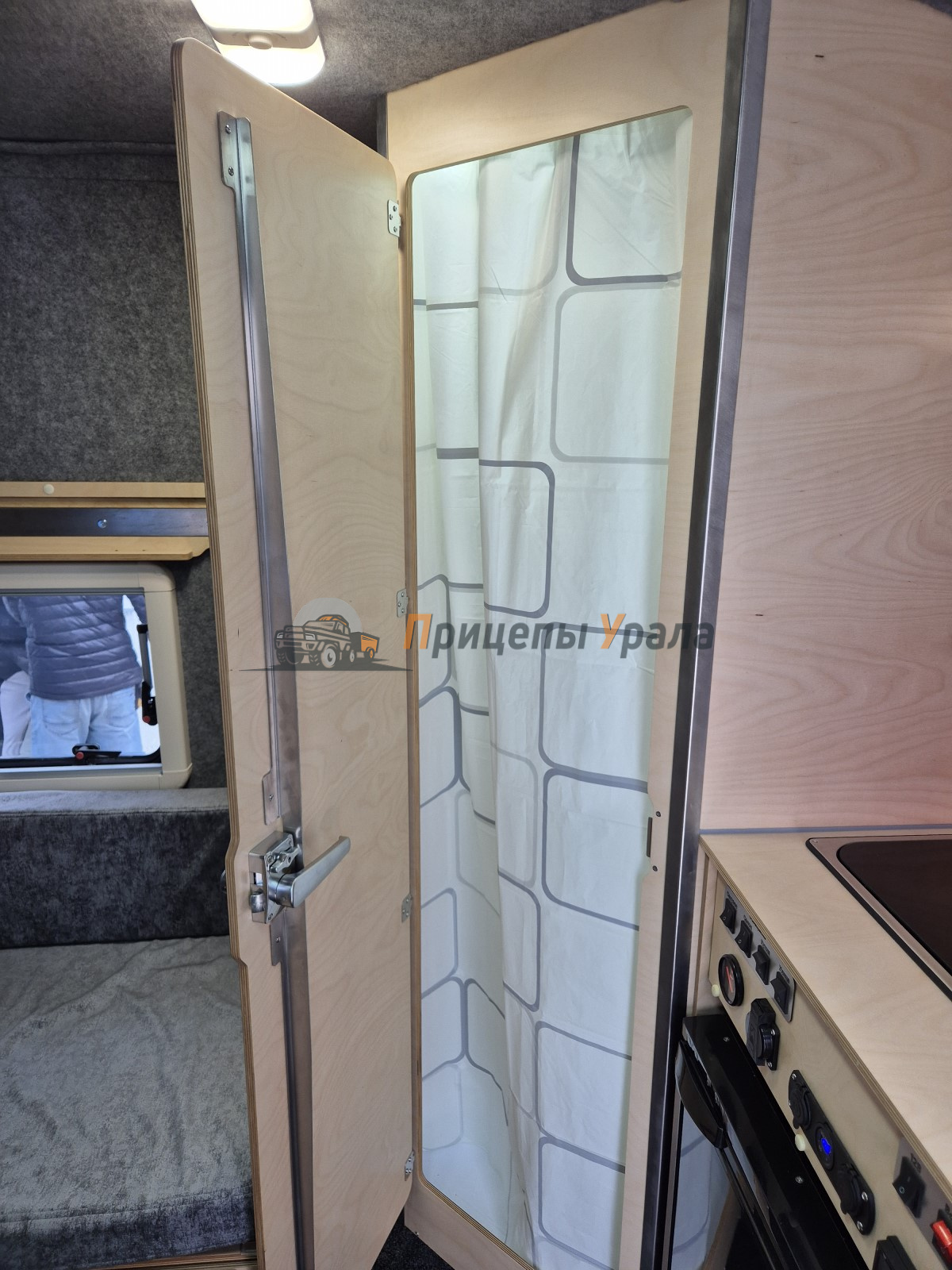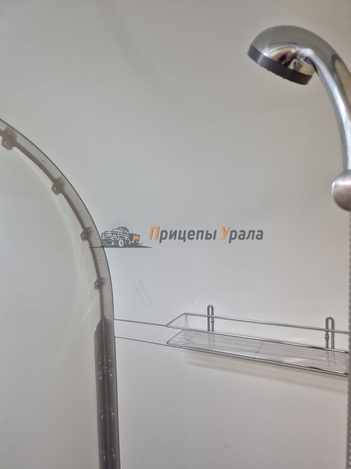 Кроме того, в прицепе предусмотрен санитарный узел, включающий душевой поддон со смесителем, вентиляцию, шторку и полки для гигиенических принадлежностей, а также современный биотуалет Lupmex 79112.
