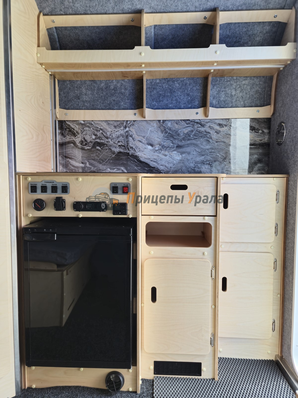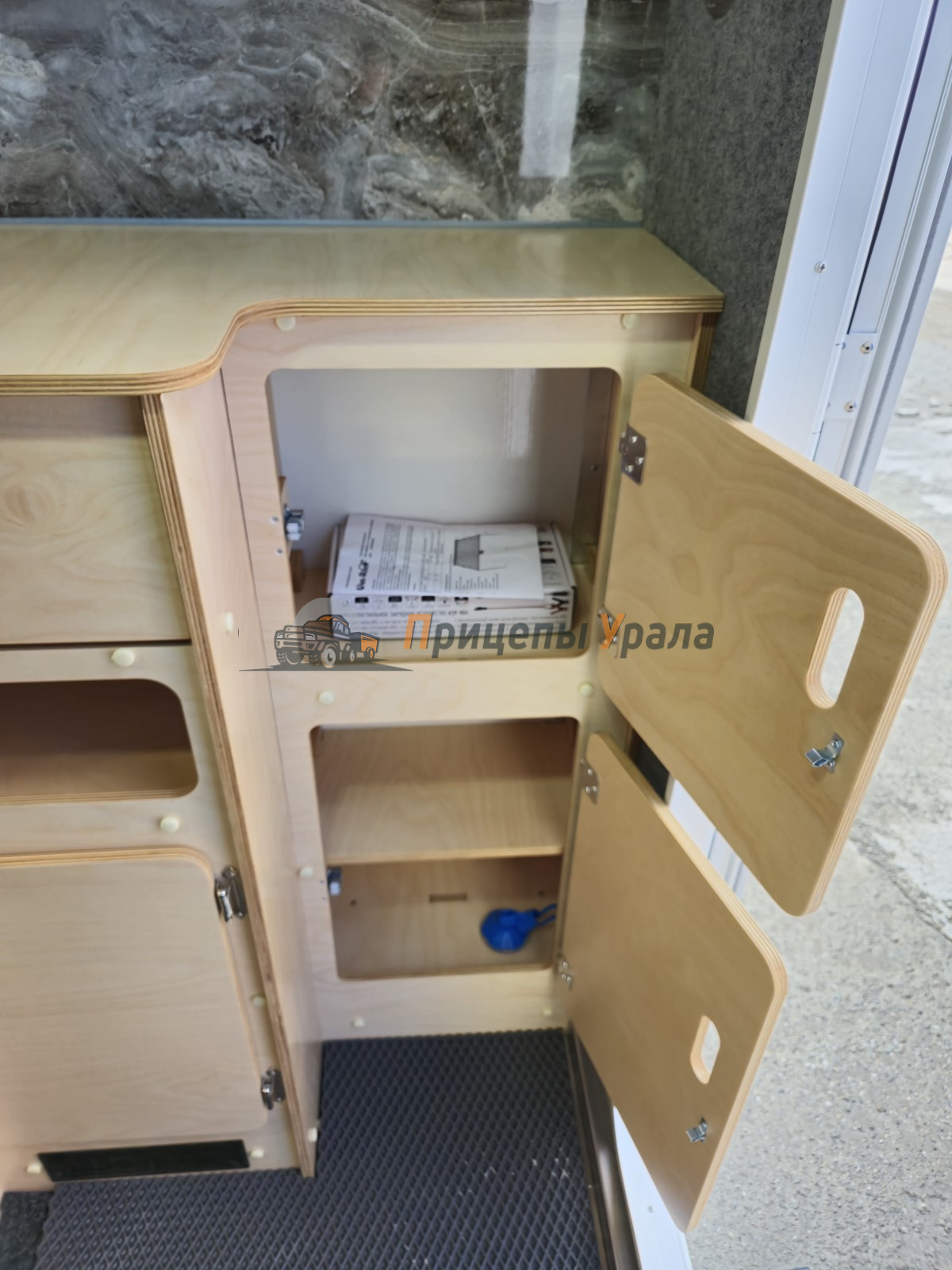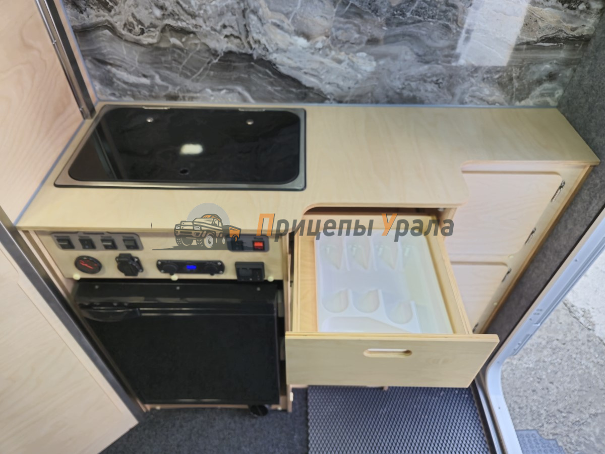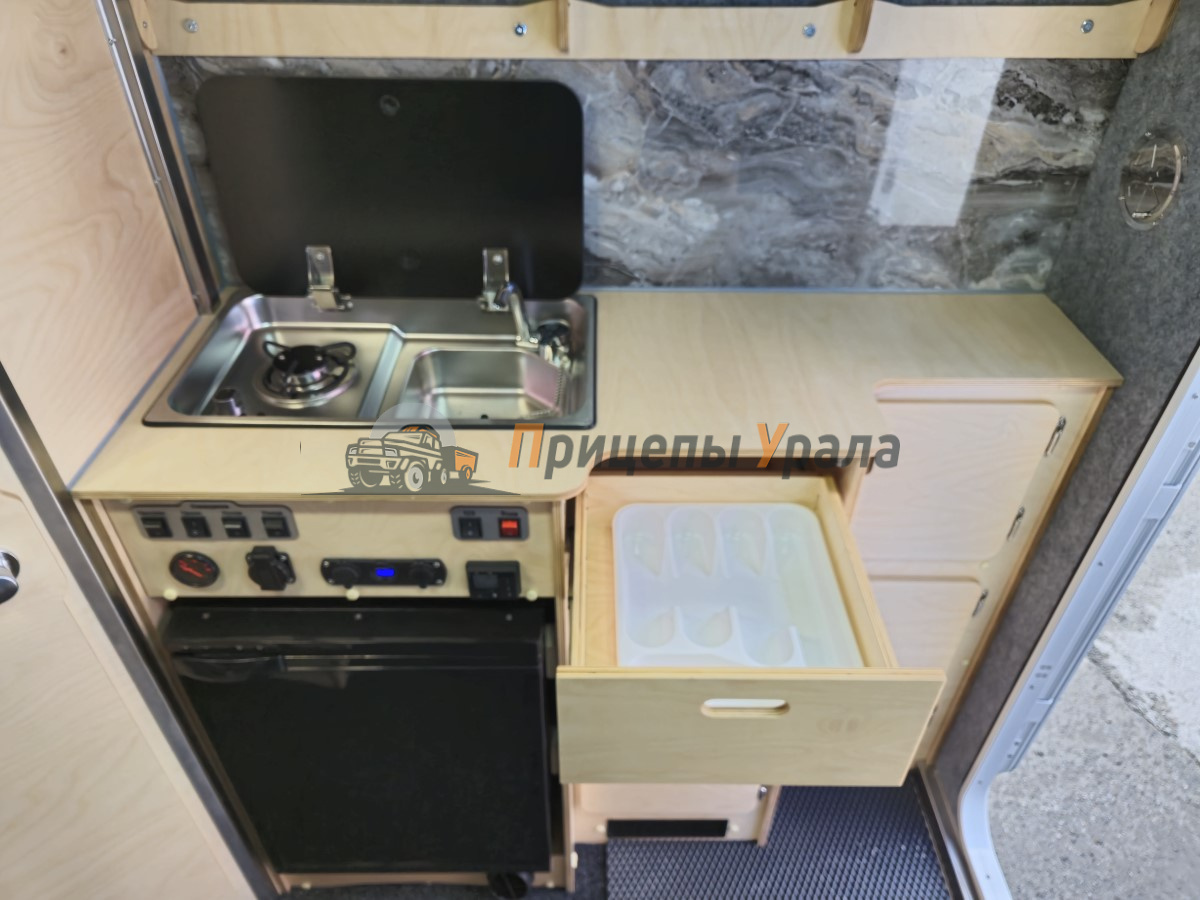 - Плита с одной конфоркой, совмещённая с раковиной. Кран для воды. Погружной насос на 12 В. Бак для чистой воды объёмом 50 литров. Заливная горловина для воды. Прямой слив канализации;