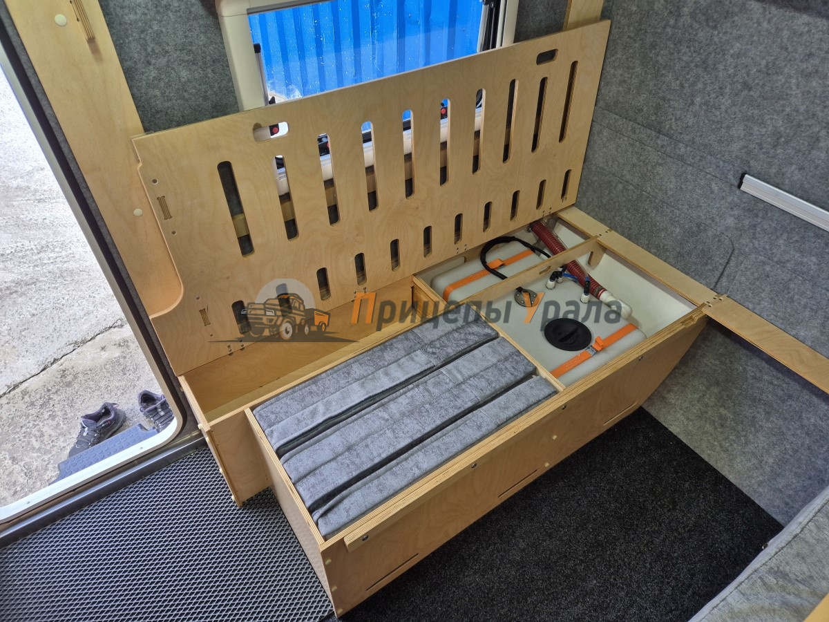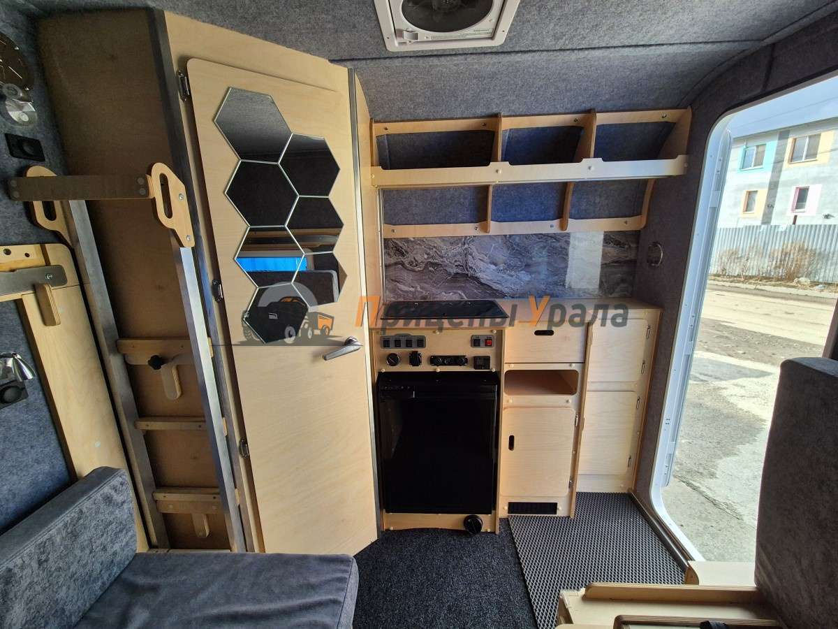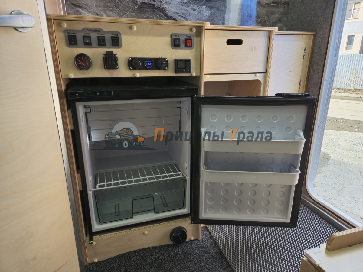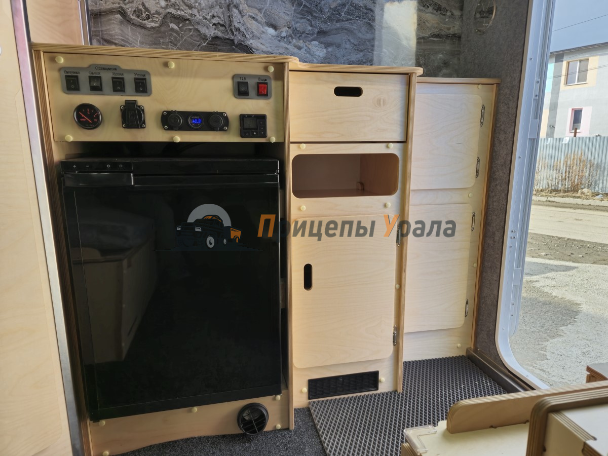 - Плита с одной конфоркой, совмещённая с раковиной. Кран для воды. Погружной насос на 12 В. Бак для чистой воды объёмом 50 литров. Заливная горловина для воды. Прямой слив канализации;
