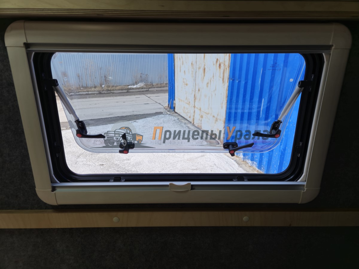 - Окна размером 700 мм на 400 мм с откидным открыванием, изготовленная и двойным акриловым стеклом, внутренней рамкой со встроенной москитной сеткой и шторкой, 2 штуки;