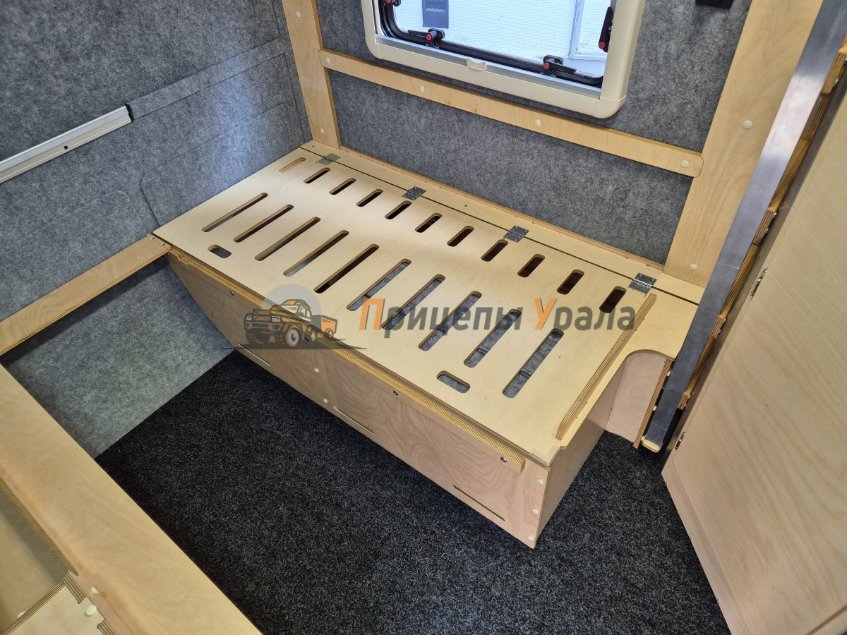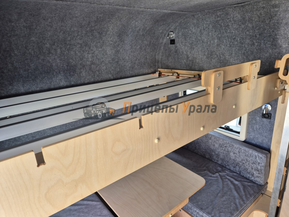- Дополнительная двуспальная кровать размером 1930 мм на 1300 мм на верхнем ярусе, которая легко превращается в полку;