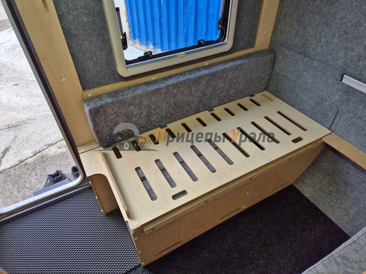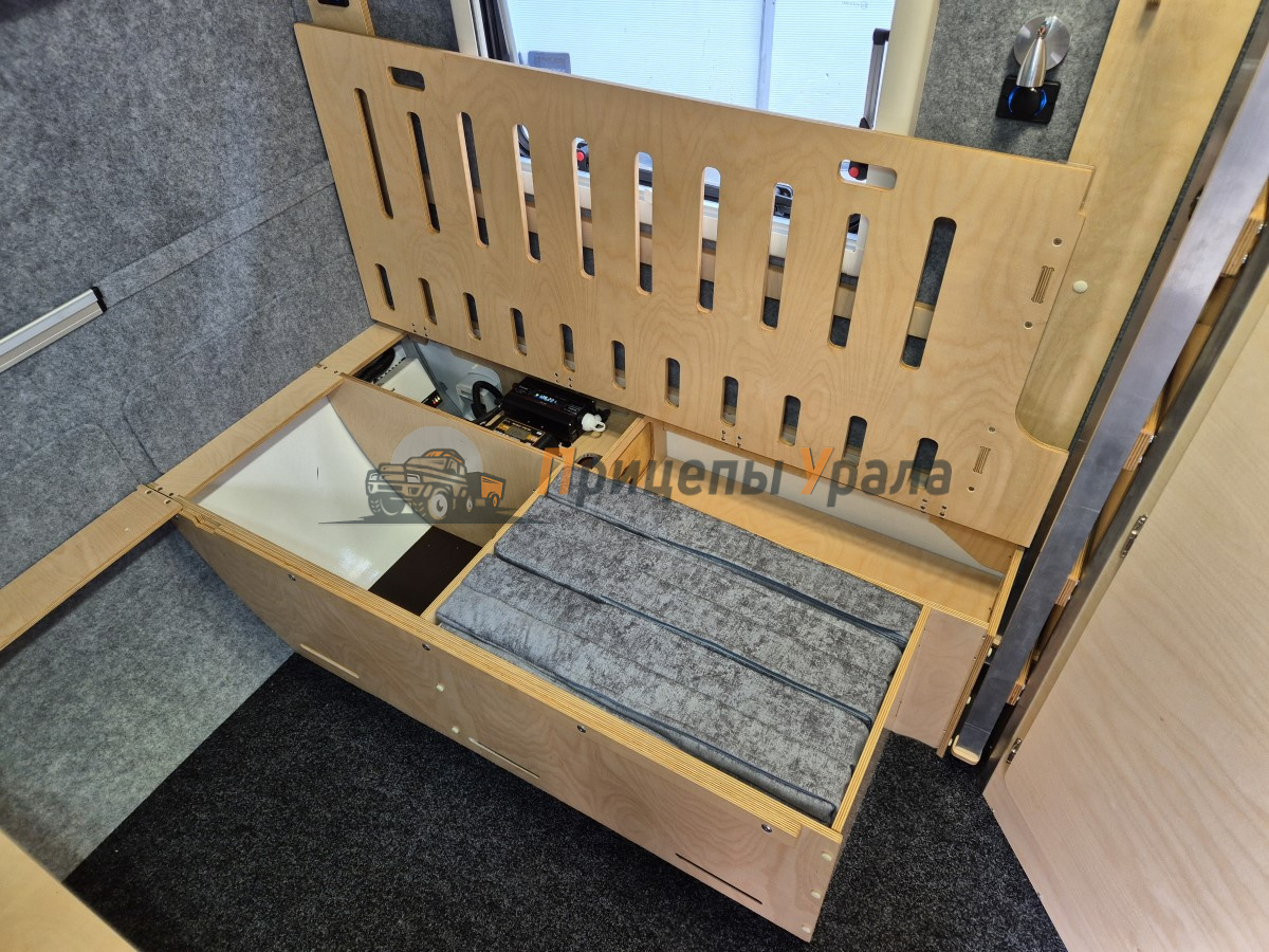 - Рундуки с секционными матрасами, которые можно трансформировать в двуспальную кровать. Размер спального места — 1930 мм на 1300 мм. Обеденный стол на «ломаной» ножке. Ниши для установки оборудования;