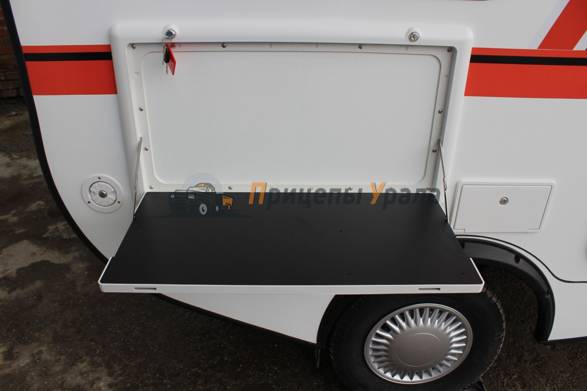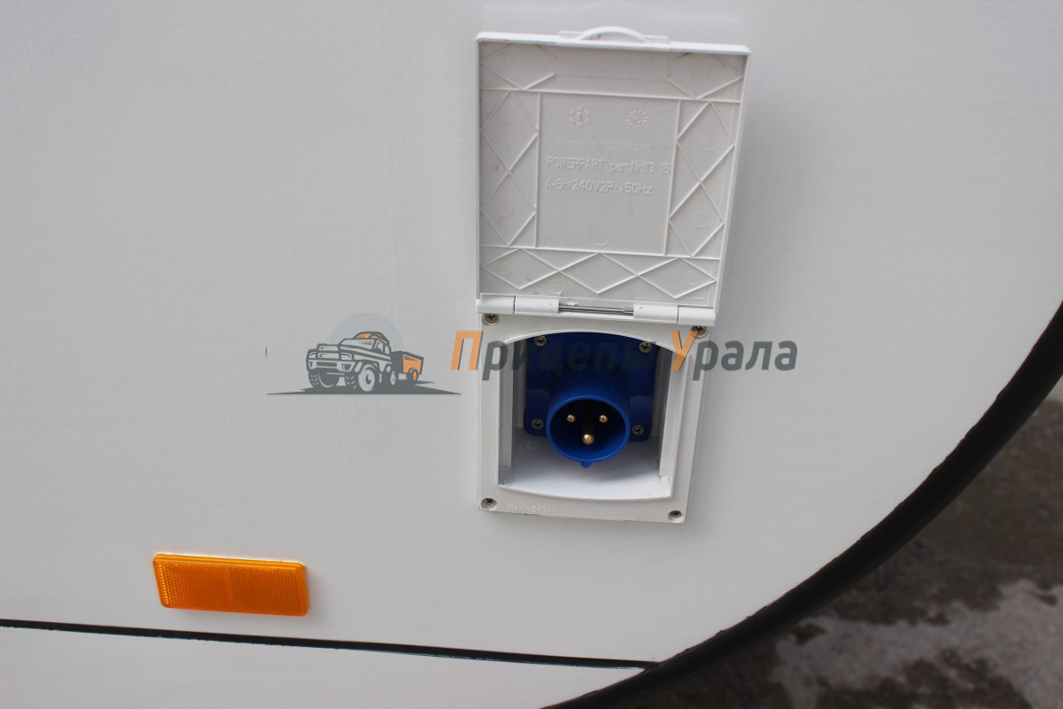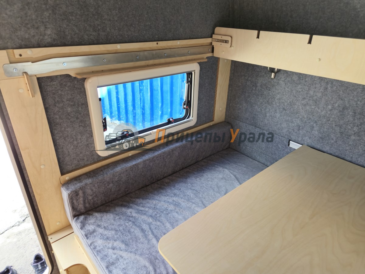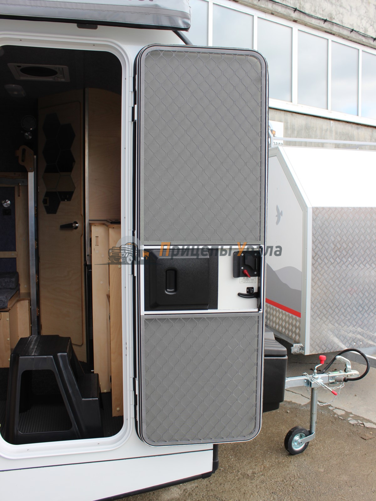 В качестве дополнительных опций на прицеп установлены выдвигаемая маркиза, вещевой рундук, внешний столик и уличное освещение. Так же есть возможность подключение кемпера к внешней электрической сети 220В, помимо этого кемпер оснащен гибкими солнечными панелями для зарядки аккумуляторной батареи.