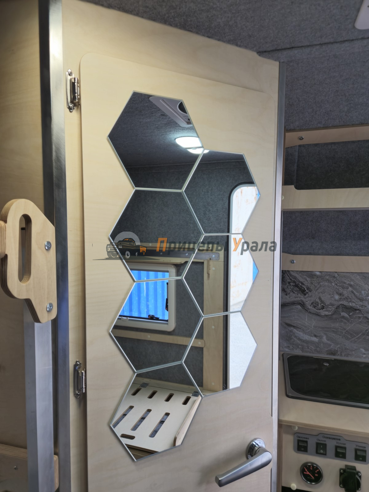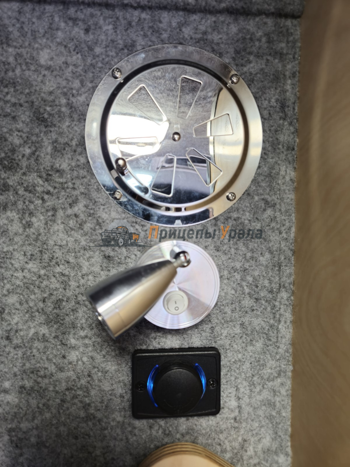 - Светодиодные светильники с встроенными выключателями для освещения салона — 2 штуки, для кухни — 1 штука, для душевой — 1 штука;
