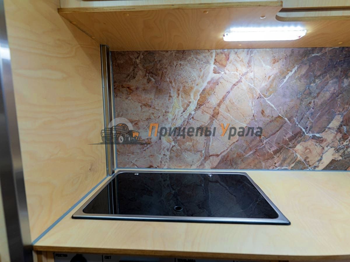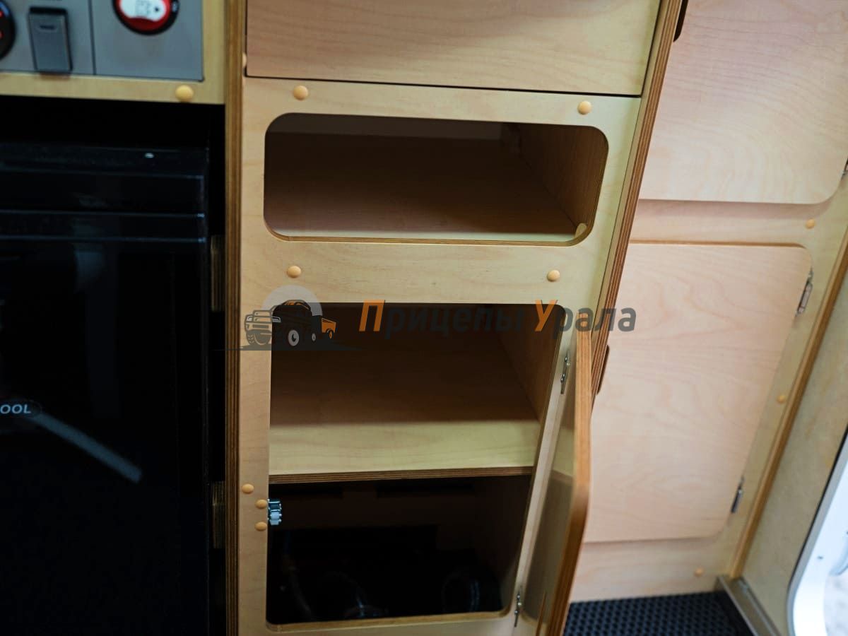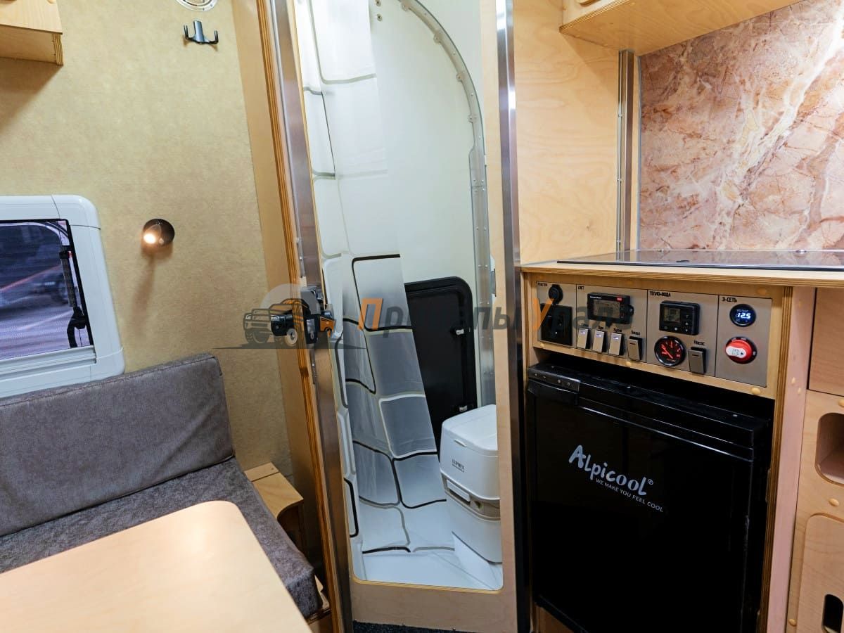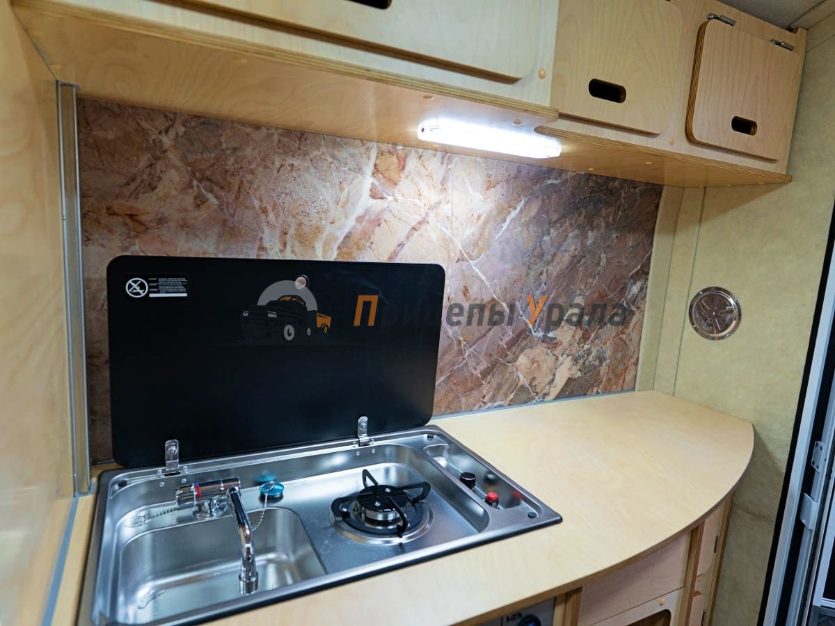 ● Кухня: Кухонный модуль с раковиной, совмещённой с газовой плитой (1 конфорка) и краном для подачи воды, а также нижней нишей с встраиваемым компрессорным авто холодильником. Столешницей, выдвижными ящиками и верхним модулем с полками.