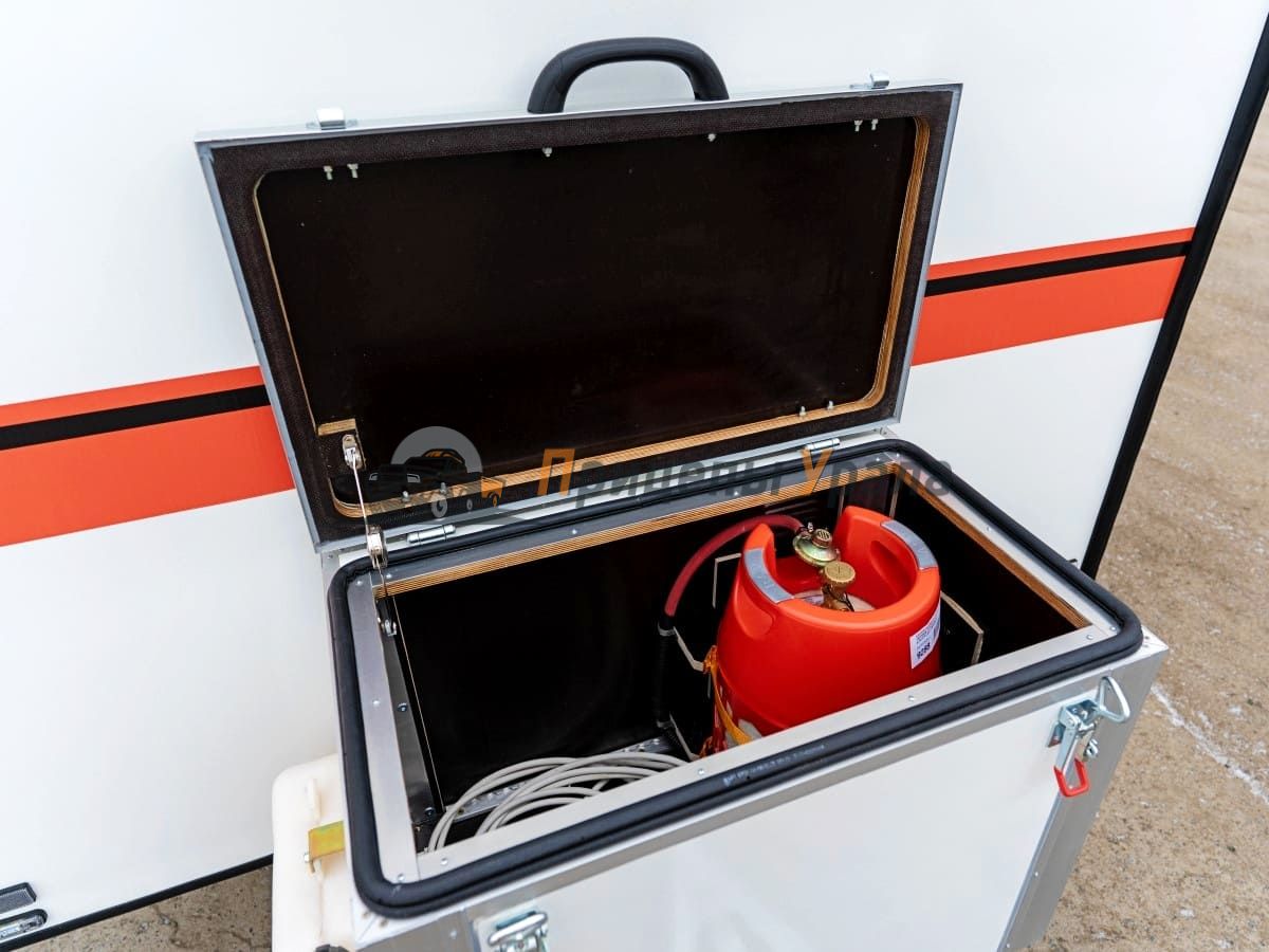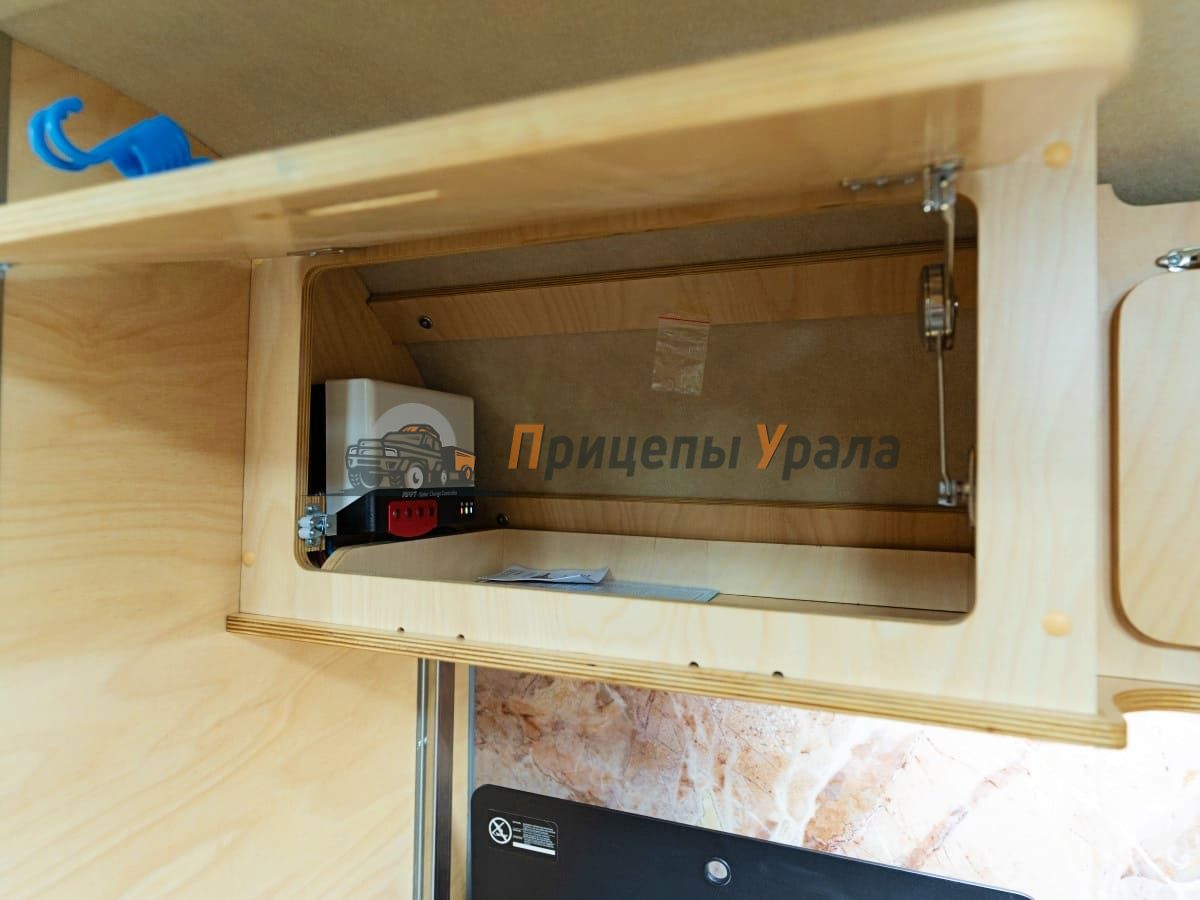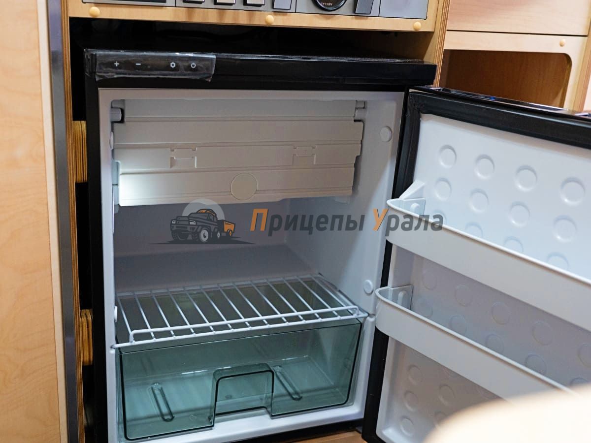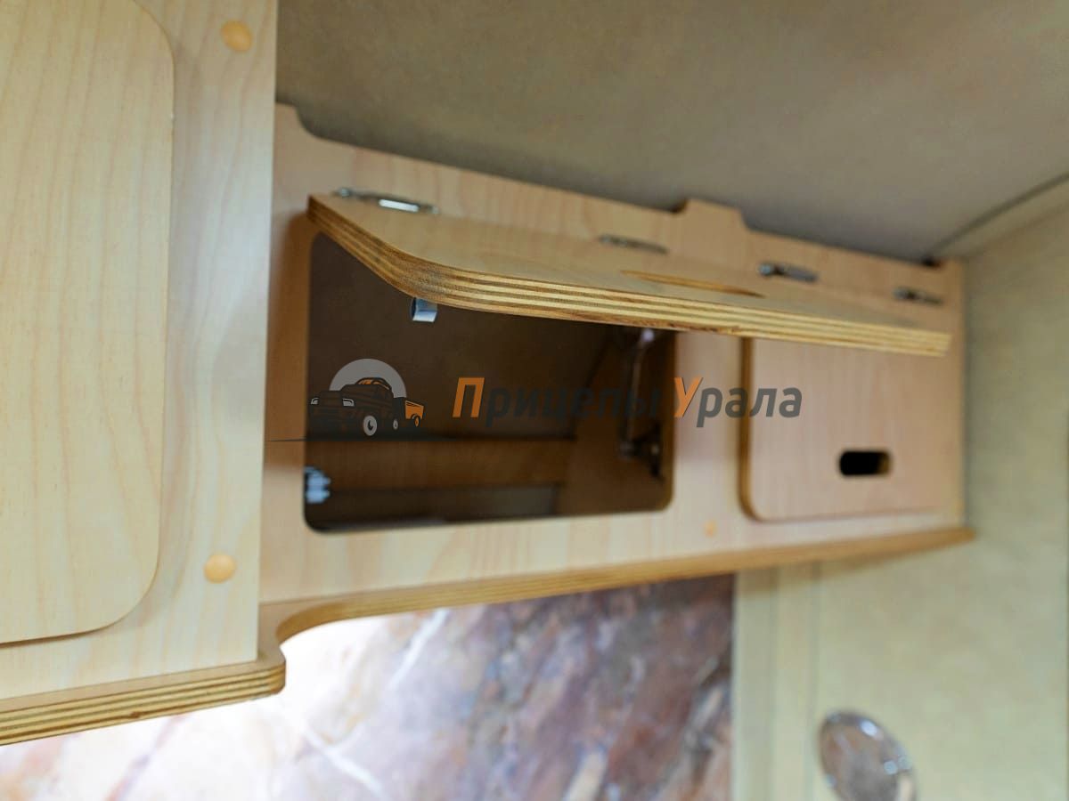 ● Кухня: Кухонный модуль с раковиной, совмещённой с газовой плитой (1 конфорка) и краном для подачи воды, а также нижней нишей с встраиваемым компрессорным авто холодильником. Столешницей, выдвижными ящиками и верхним модулем с полками.