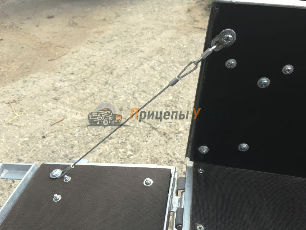 Металлический трос крепления борта прицепа в горизонтальном положении позволяет перевозить длинные грузы с открытым задним или передним бортом. В комплекте - карабин для быстрого снятия борта прицепа.