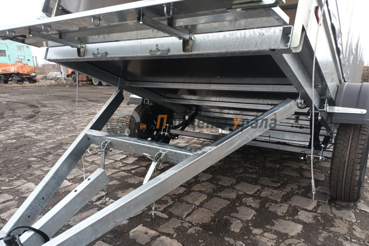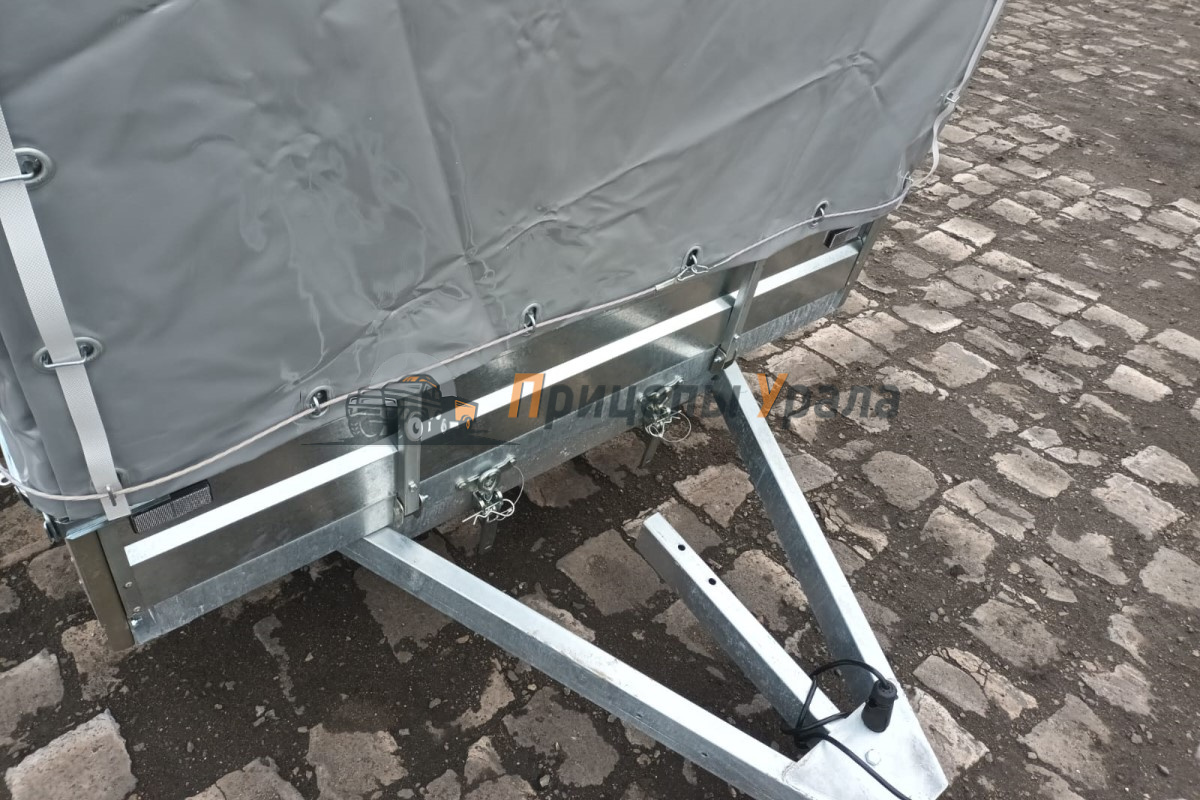 Рама прицепа несущая, состоит из продольных лонжеронов и поперечных балок, изготовленных из гнутых стальных профилей и труб прямоугольного сечения (80*40*2 мм). Прицеп комплектуется V-образным дышлом из профиля 80*40*2 мм, с удлинителем дышла из профиля 80*40*3 мм.