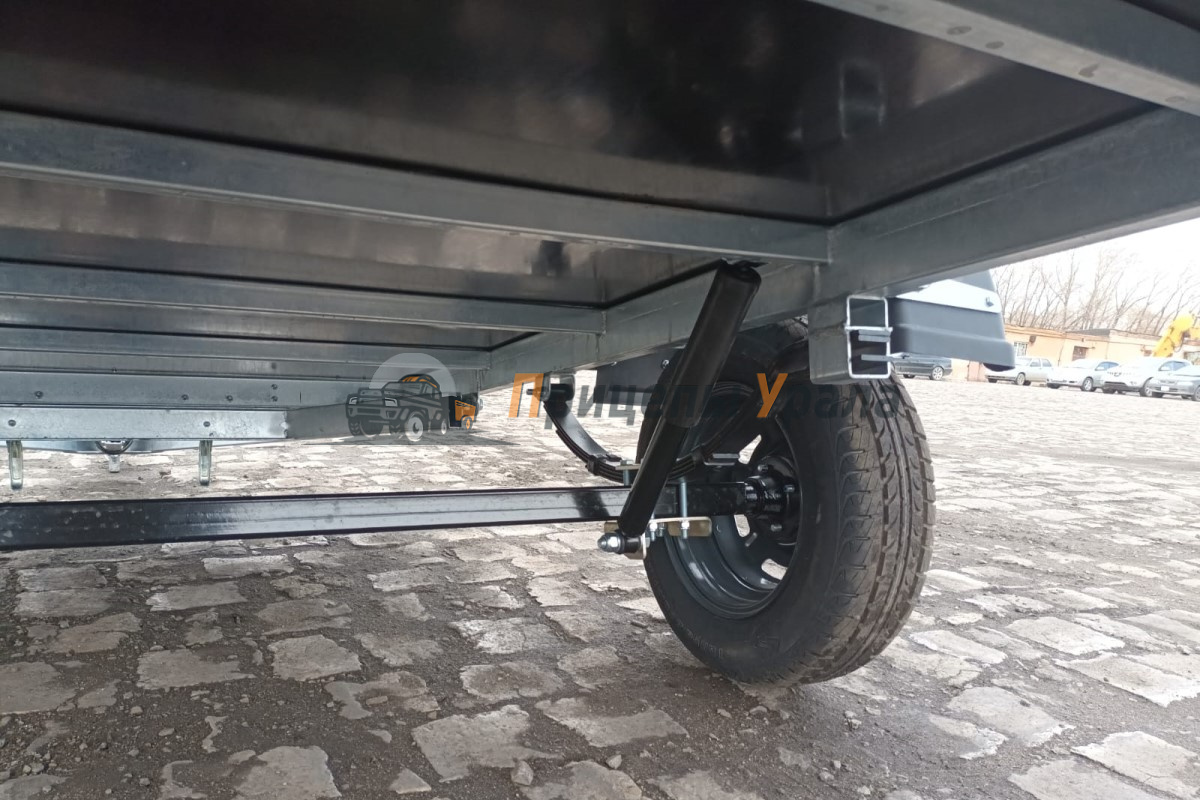 Подвеска прицепа зависимая рессорная (4 листа) c гидравлическими телескопическими амортизаторами. Ось прицепа выполнена из квадратного профиля 4 мм, ступица «ВолгаАвтоПром».