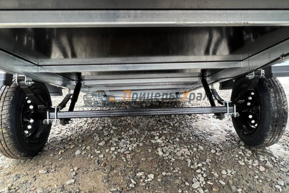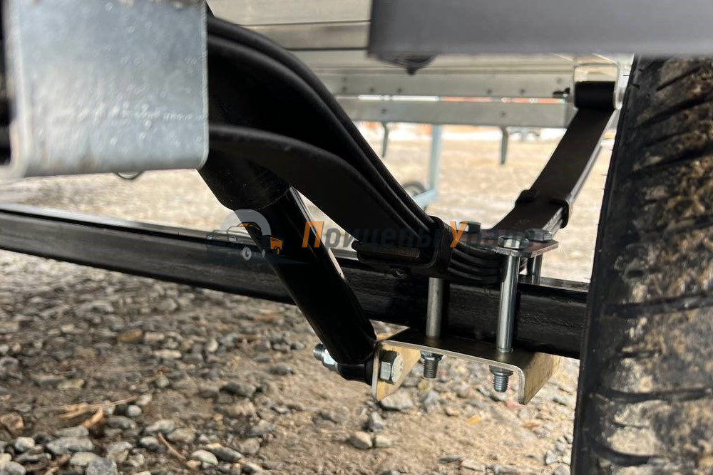 Подвеска прицепа зависимая рессорная (4 листа) c гидравлическими телескопическими амортизаторами. Ось прицепа выполнена из квадратного профиля 4 мм, ступица «ВолгаАвтоПром».