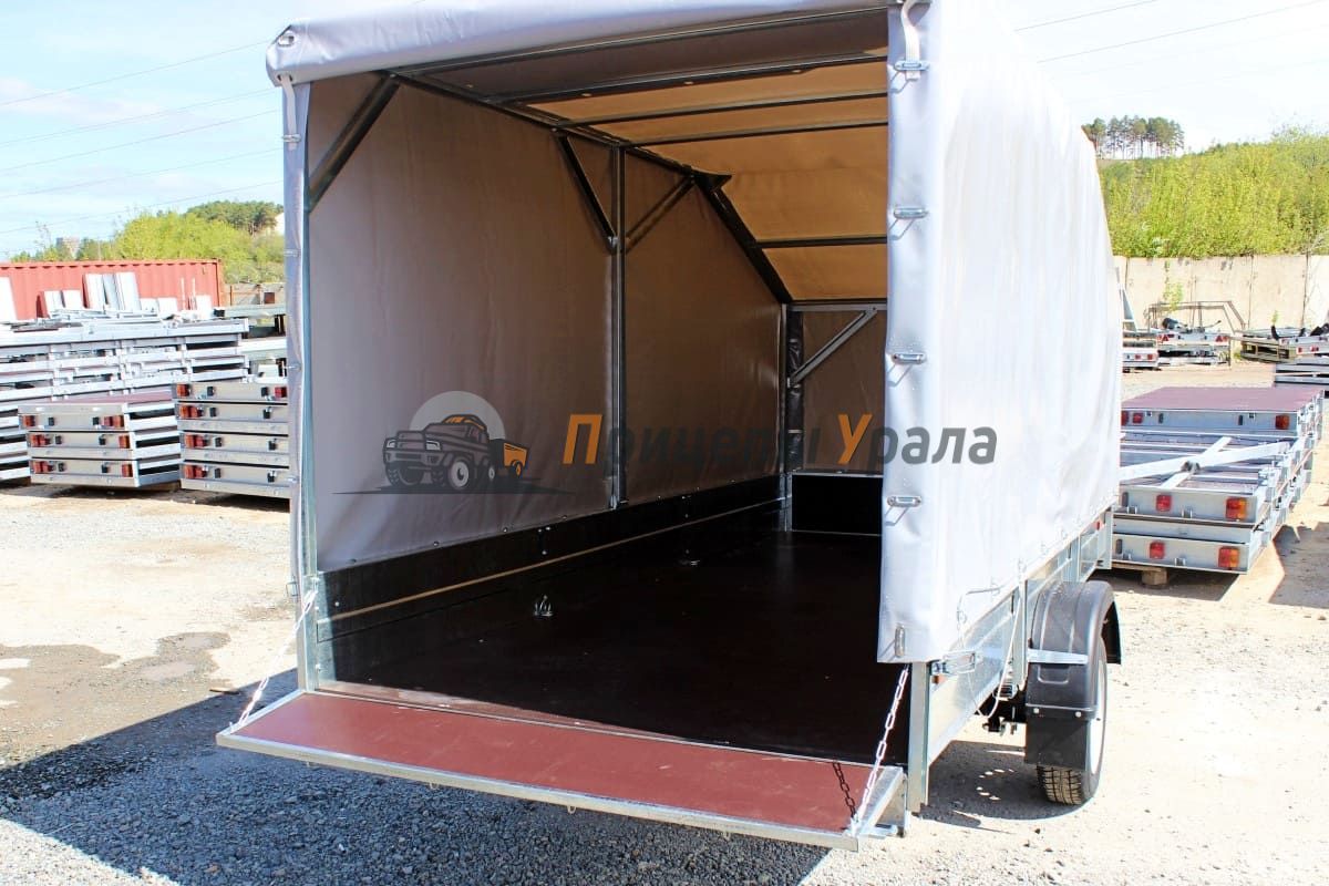 Пол платформы выполнен из фанеры толщиной 9 мм. Дополнительно можно установить тент с каркасом для защиты груза от атмосферных осадков и дорожной грязи. Тент выполнен из плотной тентовой ткани (600 г/м) с овальными люверсами и тросом с карабинами. Каркас оцинкованный, болтовой со стопорным крепежом.