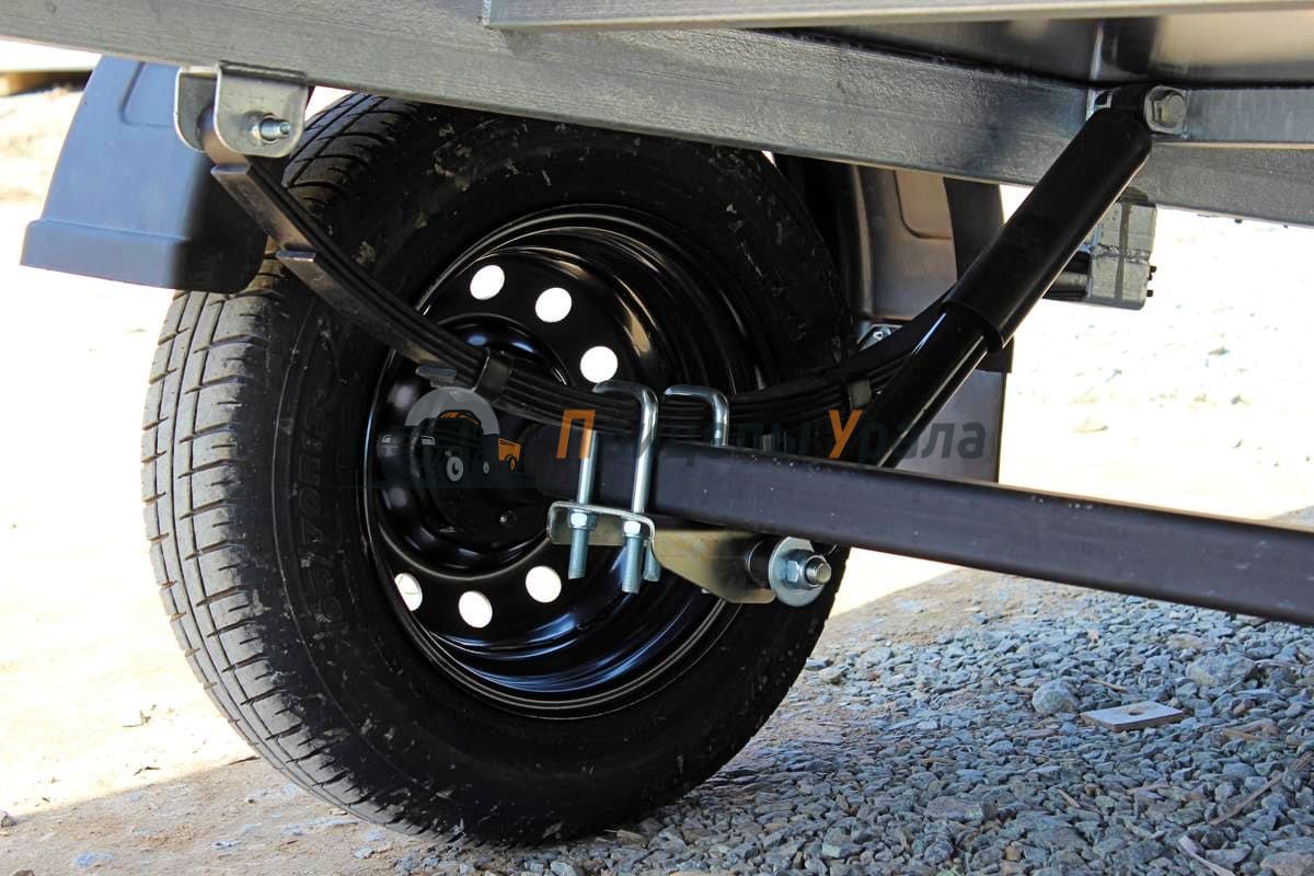 Подвеска прицепа зависимая рессорная (4 листа) c гидравлическими телескопическими амортизаторами. Ось прицепа выполнена из квадратного профиля 4 мм, ступица «ВолгаАвтоПром».