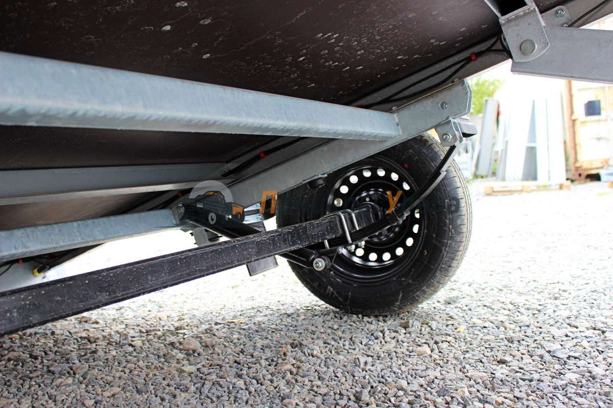 ● Рессорная подвеска (2 рессоры по 4 листа) с гидравлическими амортизаторами сохраняет стабильную плавность хода при разной загруженности прицепа.