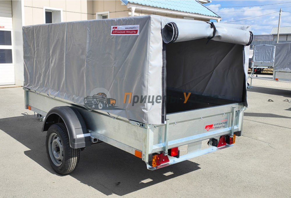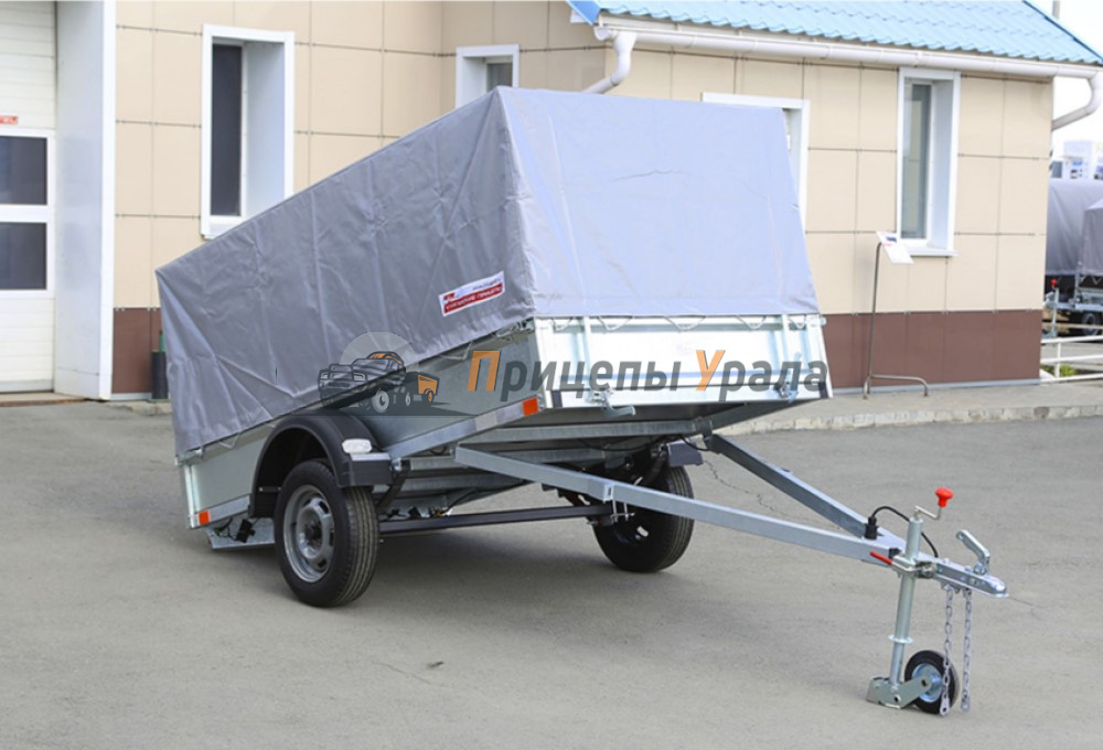 Тент и дуги. Для защиты груза от атмосферных осадков и дорожной грязи на прицеп рекомендуется установить комплект дуг и тент. Два вида тентов разной высоты: 0,25 и 0,75 метра от верхней кромки борта. Высокий тент имеет передний и задний клапан на молнии и липучке (защита замка от грязи). Для удобного доступа внутрь кузова, клапан сворачивается и фиксируется сверху липкой лентой.