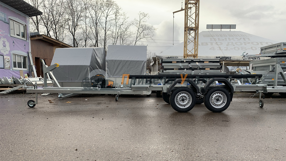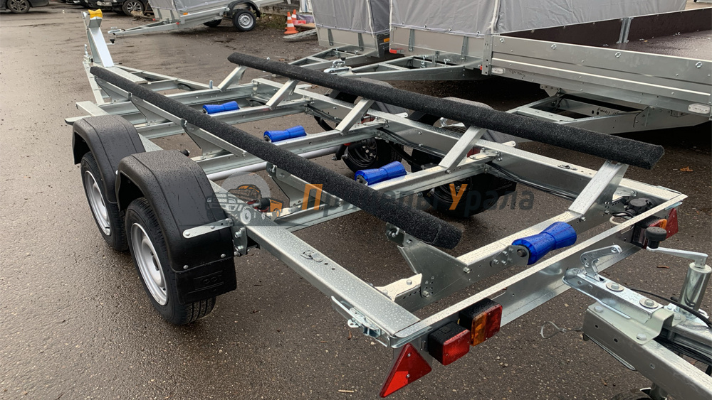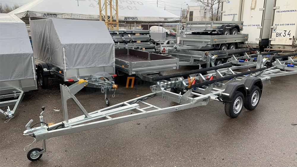 Двухосный прицеп ССТ-7132-12 предназначен для перевозки гидроциклов, катеров и ПВХ – лодок длиной до 5,2 метра. Изготовлен прицеп из оцинкованного листа толщиной 3 мм. Детали изготовлены с применением лазерной технологии раскроя. Для обеспечения правильной развесовки носовой упор имеет регулировку по длине и высоте прицепа. Широкий диапазон регулировки ложементов позволяет перевозить суда с различным углом килеватости. Рессорная подвеска двухосная на 4-х рессорах с гидравлическими амортизаторами. Особенностью прицепа является наличие функциии опрокидывания грузовой платформы. Опрокидывание платформы позволяет осуществлять погрузку/разгрузку судна на неподготовленном берегу водоема без необходимости заезда глубоко в воду. Благодаря возможности регулировки каждой опоры по отдельности ложементы можно адаптировать под различные обводы корпуса судна. Задняя поперечина с установленными на ней фонарями съемная, что предотвращает попадания воды в фонари и замыкание светотехники.