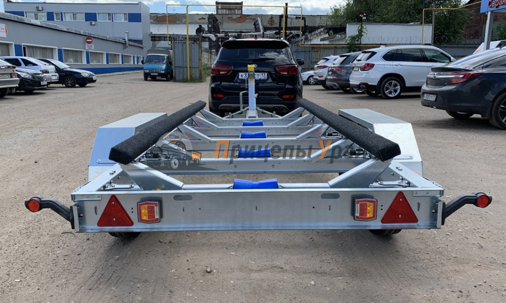 Двухосный прицеп ССТ-7132-5К предназначен для перевозки гидроциклов, катеров и ПВХ – лодок длиной до 5,2 метров. Изготовлен прицеп из оцинкованного листа толщиной 3 мм. Детали изготовлены с применением лазерной технологии раскроя. Для обеспечения правильной развесовки носовой упор имеет регулировку по длине и высоте прицепа. Широкий диапазон регулировки ложементов позволяет перевозить суда с различным углом килеватости. Рессорная подвеска двухосная на 4-х рессорах с гидравлическими амортизаторами. Особенностью прицепа является наличие функциии опрокидывания грузовой платформы. Опрокидывание платформы позволяет осуществлять погрузку/разгрузку судна на неподготовленном берегу водоема без необходимости заезда глубоко в воду. Благодаря возможности регулировки каждой опоры по отдельности ложементы можно адаптировать под различные обводы корпуса судна. Задняя поперечина с установленными на ней фонарями съемная, что предотвращает попадания воды в фонари и замыкание светотехники.