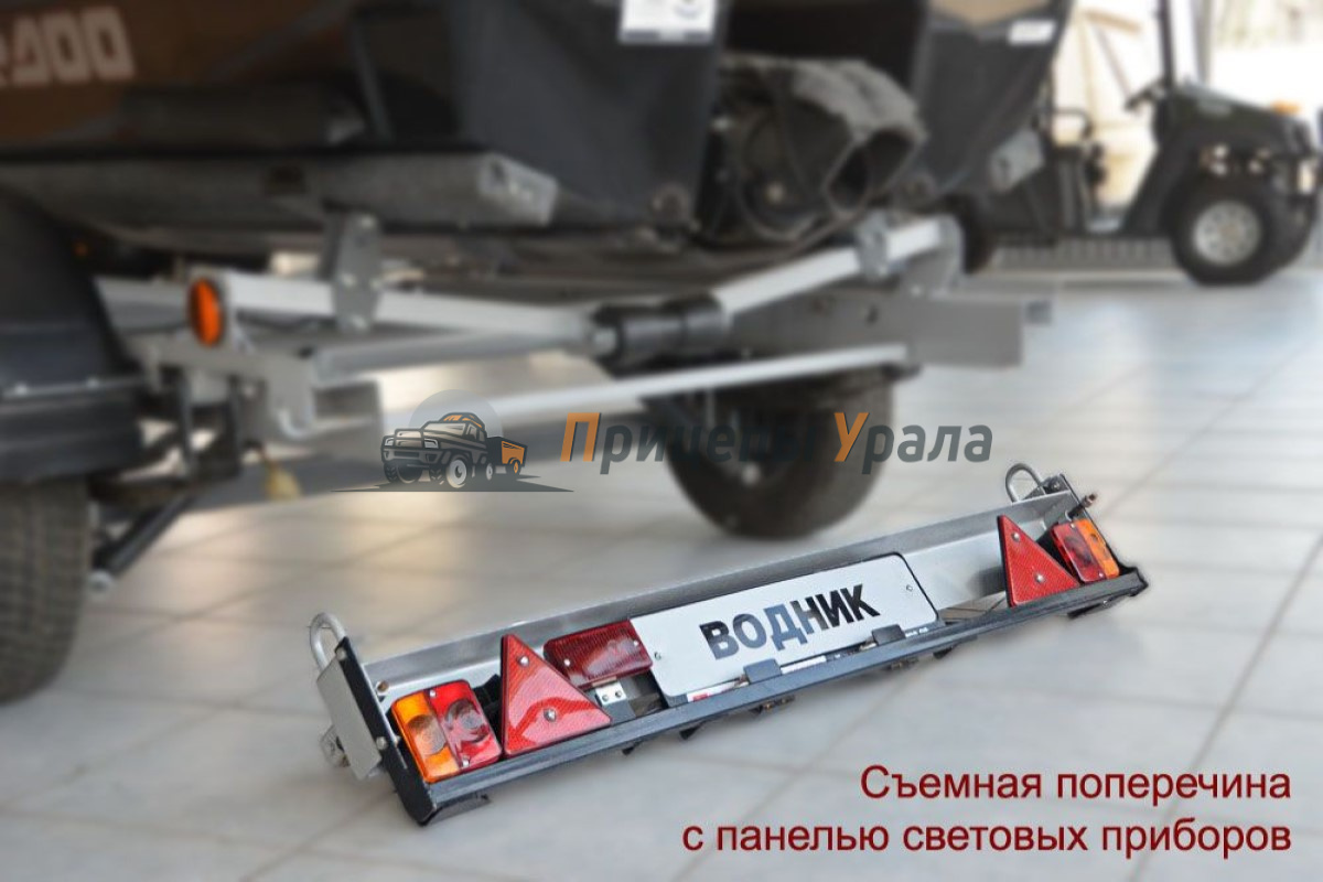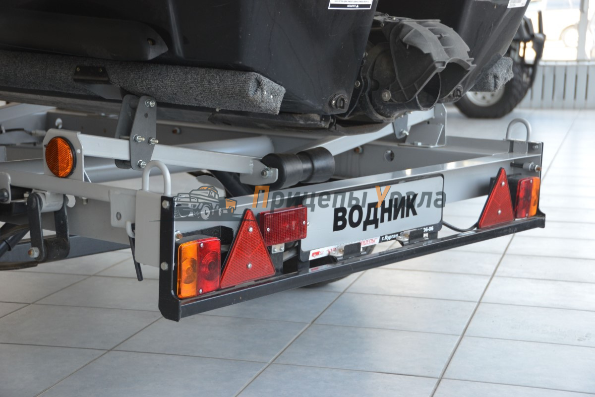 Прицеп имеет легкосъемную заднюю панель световых приборов, что позволяет заехать прицепом в водоем задним ходом для удобного спуска лодки непосредственно на воду, без риска замочить электрооборудование.
