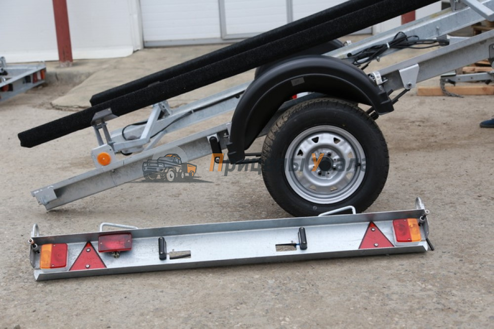 Прицеп имеет легкосъемную заднюю панель световых приборов, что позволяет заехать прицепом в водоем задним ходом для удобного спуска лодки непосредственно на воду, без риска замочить электрооборудование.