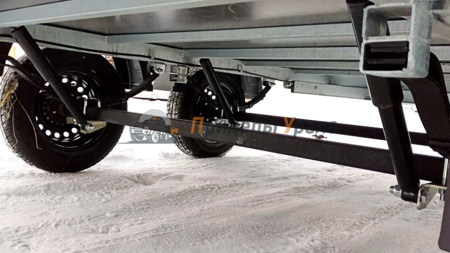 Подвеска прицепа зависимая рессорная (4 листа) c гидравлическими телескопическими амортизаторами. Ось прицепа выполнена из квадратного профиля 4 мм, ступица «ВолгаАвтоПром».