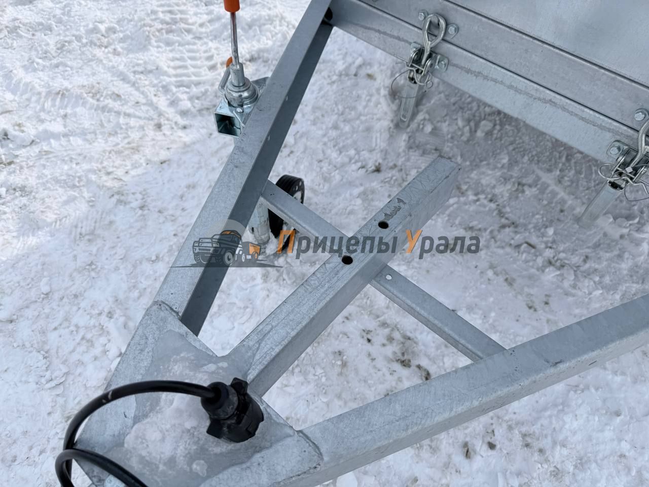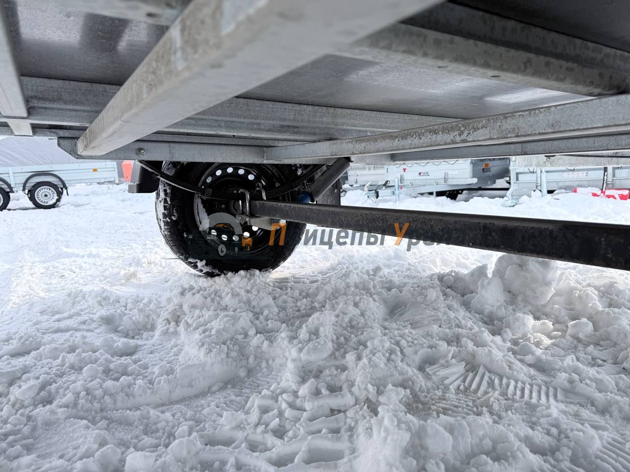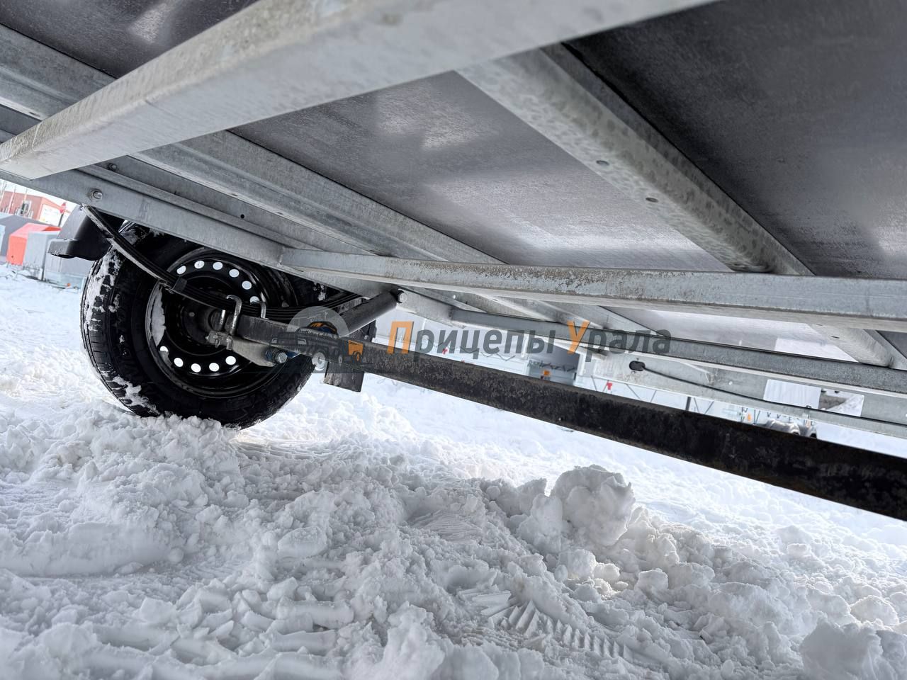 Подвеска прицепа зависимая рессорная (4 листа) c гидравлическими телескопическими амортизаторами. Ось прицепа выполнена из квадратного профиля 4 мм, ступица «ВолгаАвтоПром».