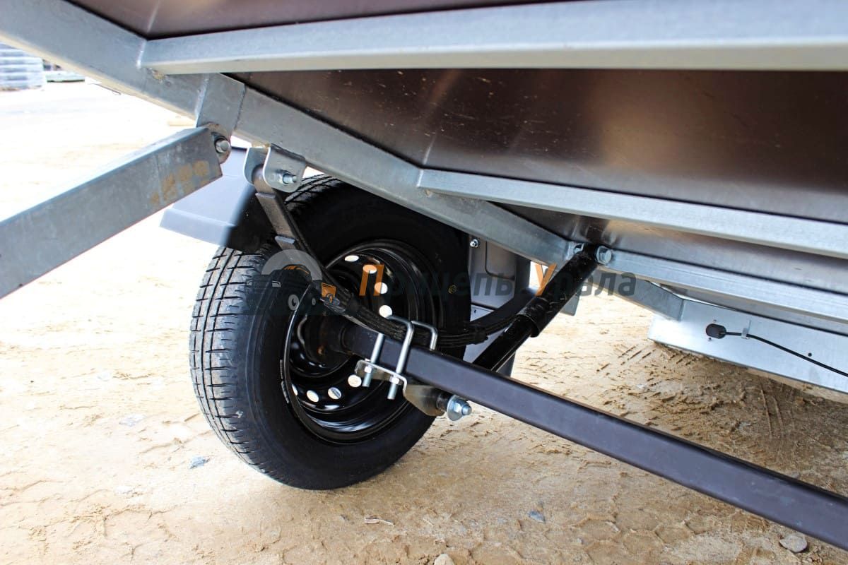 Подвеска прицепа зависимая рессорная (4 листа) c гидравлическими телескопическими амортизаторами. Ось прицепа выполнена из квадратного профиля 4 мм, ступица «ВолгаАвтоПром».