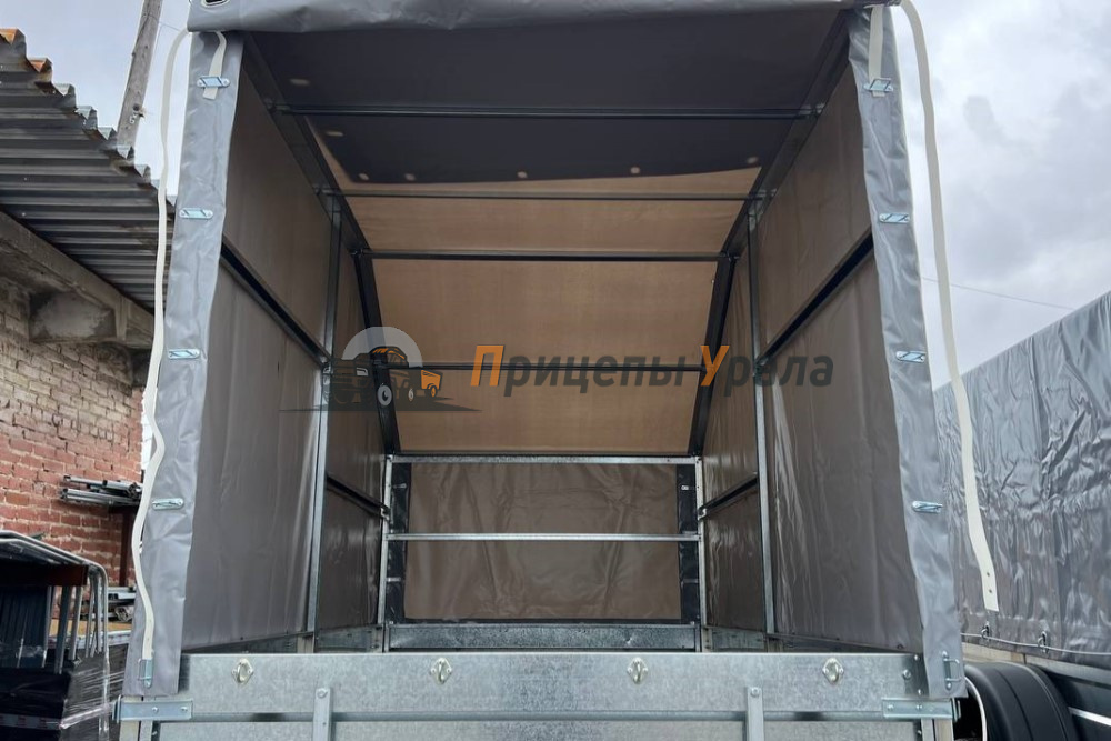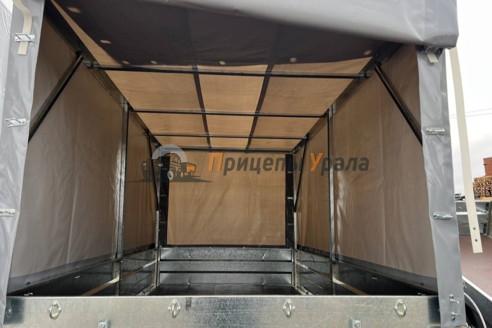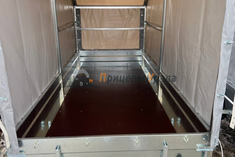 Пол платформы выполнен из фанеры толщиной 6 мм. Дополнительно можно установить тент с каркасом для защиты груза от атмосферных осадков и дорожной грязи. Тент выполнен из плотной тентовой ткани (600 г/м) с овальными люверсами и тросом с карабинами. Каркас оцинкованный, болтовой.
