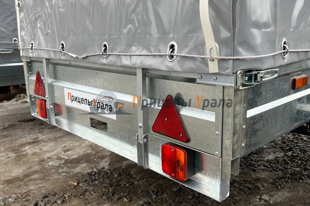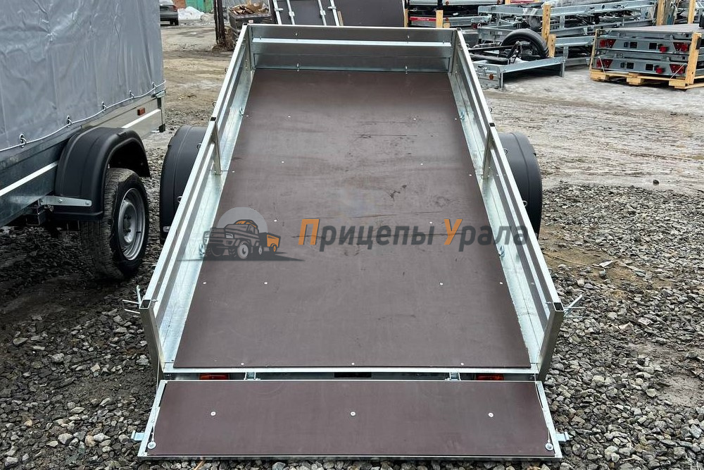 Передний и задний борта прицепа откидные. Задний борт оснащен фанерой. Толщина борта 1 мм. Стойка борта толщиной 2 мм.
