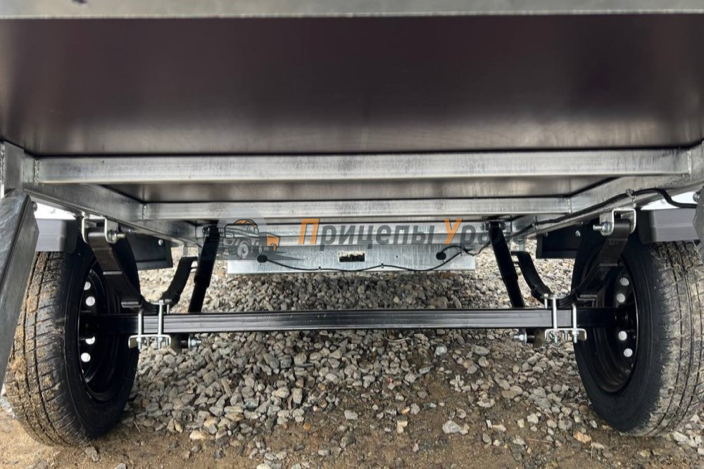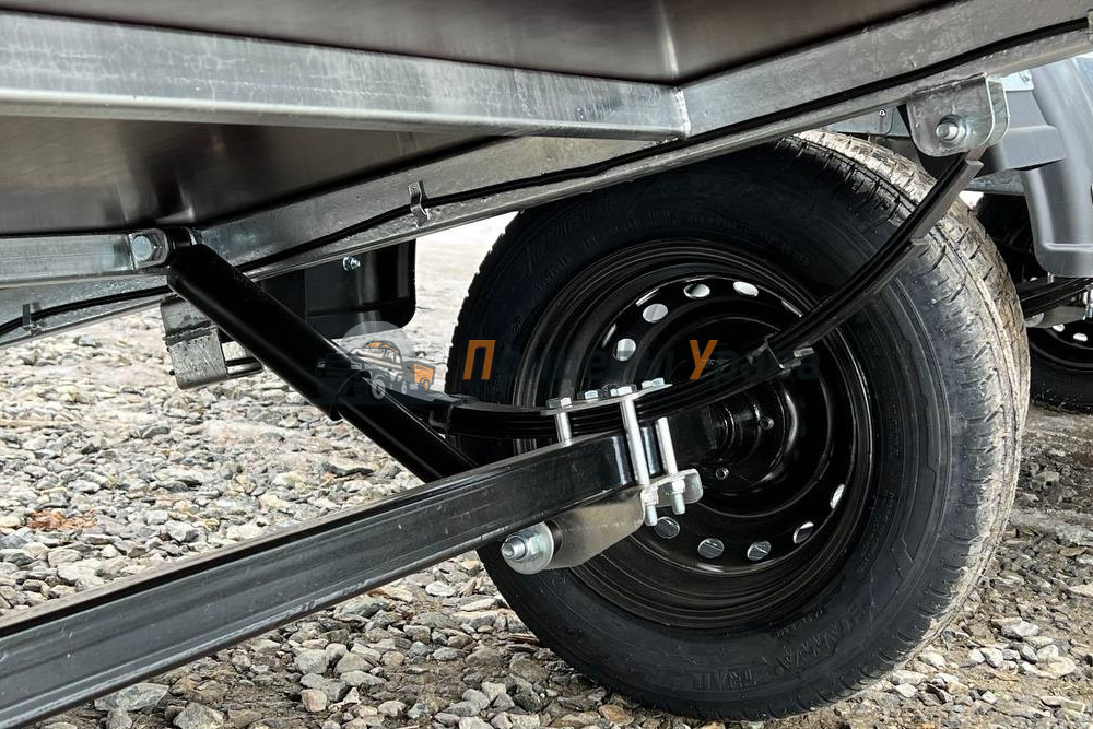 Подвеска прицепа зависимая рессорная (4 листа) c гидравлическими телескопическими амортизаторами. Ось прицепа выполнена из квадратного профиля 4 мм, ступица «ВолгаАвтоПром».