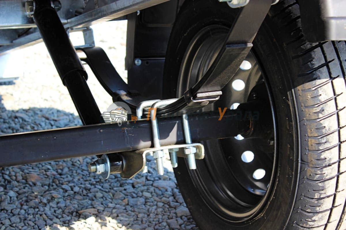 Подвеска прицепа зависимая рессорная (3 листа) c гидравлическими телескопическими амортизаторами. Ось прицепа выполнена из квадратного профиля 4 мм, ступица «ВолгаАвтоПром».