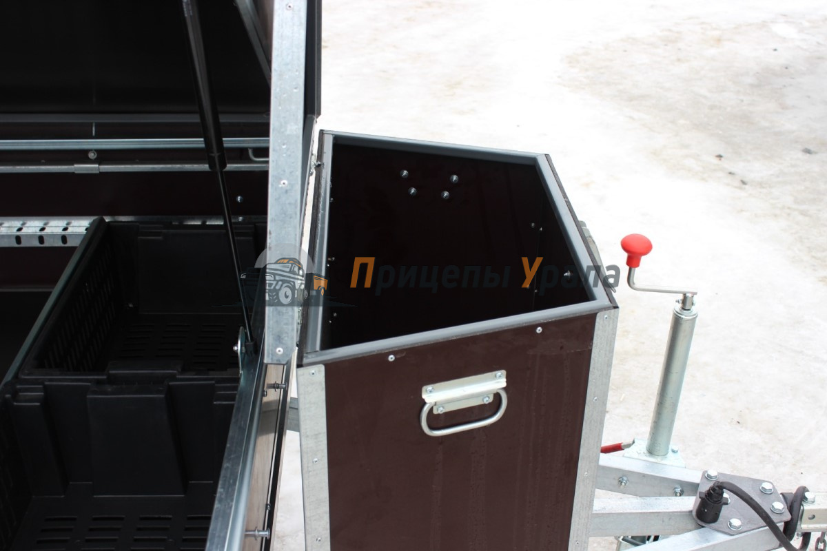 ● Первое багажное отделение – это основной кузов прицепа «Крепыша 2.5″ для перевозки редко востребованного в путешествии и, как правило, массивного груза (например, дров, мебели, кемпинговых палаток, детских колясок и велосипедов, других крупногабаритных вещей). Кузов запирается на бидонные замки с правого борта.