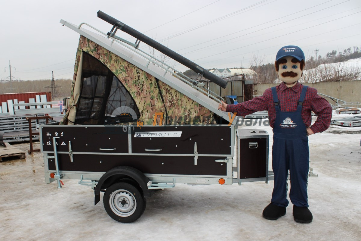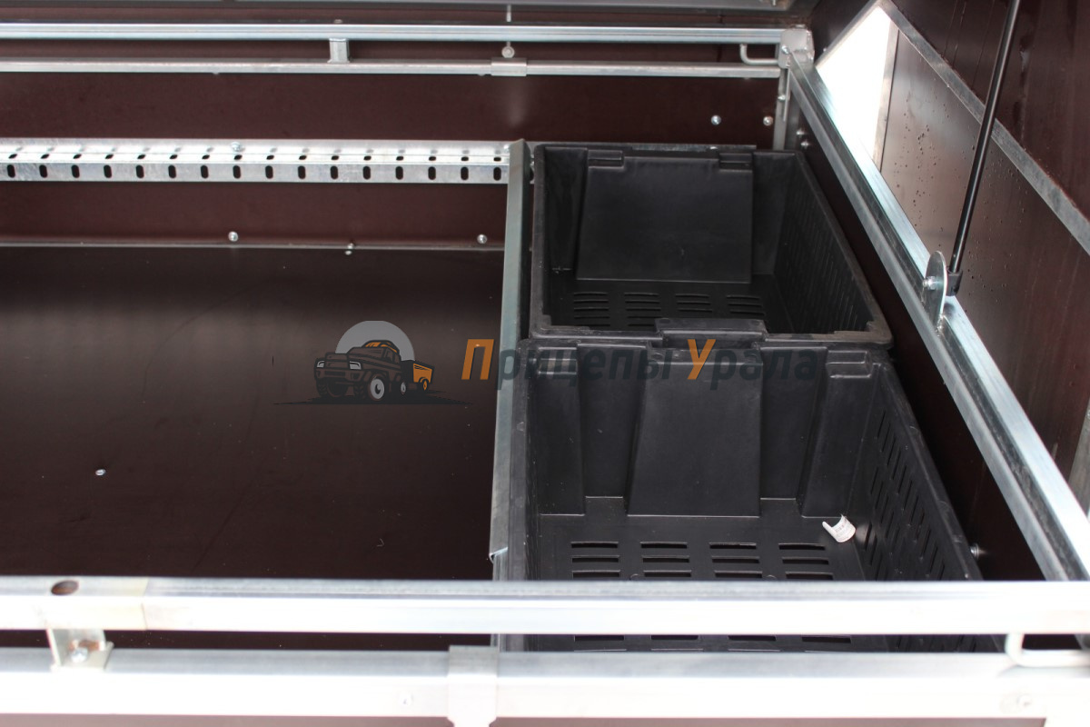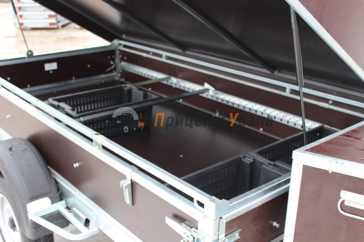 Обратим внимание про особенность верхнего съемного модуля. В нем предусмотрены пластиковые корзины для удобного складывания вещей, продуктов питания и прочей амуниции путешественников. Такое решение исключает хаотичное перемещение груза в прицепе во время движения, а также облегчает погрузочно-разгрузочные усилия. С помощью специальной телескопической планки можно зонировать пространство внутри модуля, комбинировать расположение и количество ящичков по усмотрению владельца.