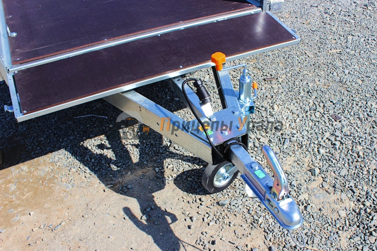 Самосвальный механизм позволяет с легкостью проводить погрузку/разгрузку техники и сыпучих материалов. Дно прицепа выполнено из многослойной ламинированной влагостойкой фанеры с сетчатым противоскользящим покрытием толщиной 9 мм. На прицепе установлены светодиодные фонари.