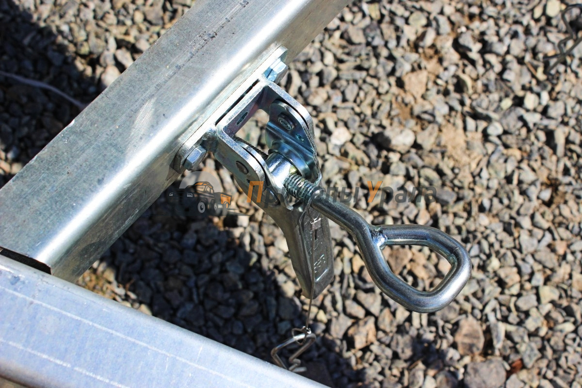 Дышло прицепа разборное на болтовых соединениях, V-образное из стальных, оцинкованных деталей выдерживает сильные динамические нагрузки. Оно выполнено из гнутого G-образного профиля переменного сечения с толщиной стенки 3 мм. Рама разборная на болтовых соединениях, из стальных, оцинкованных деталей, усиленная поперечинами из гнутого профиля.