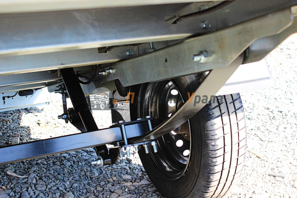 Подвеска прицепа устанавливается на отдельные подрессорники, закрепленные к раме на болтовые соединения. Подрессорники дополнительно усиливают конструкцию рамы, служат для компенсации сил действующих на раму. Подвеска – зависимая, рессорная с гидравлическими телескопическими амортизаторами (две рессоры однолистовых) сохраняет стабильную плавность хода при разной загруженности прицепа. Ось – сварная в сборе со ступицей. Рассчитана на нагрузку 750 кг, ступицы оборудованы защитными колпаками, подшипники не требуют дополнительной смазки и регулировки на протяжении всего срока службы.