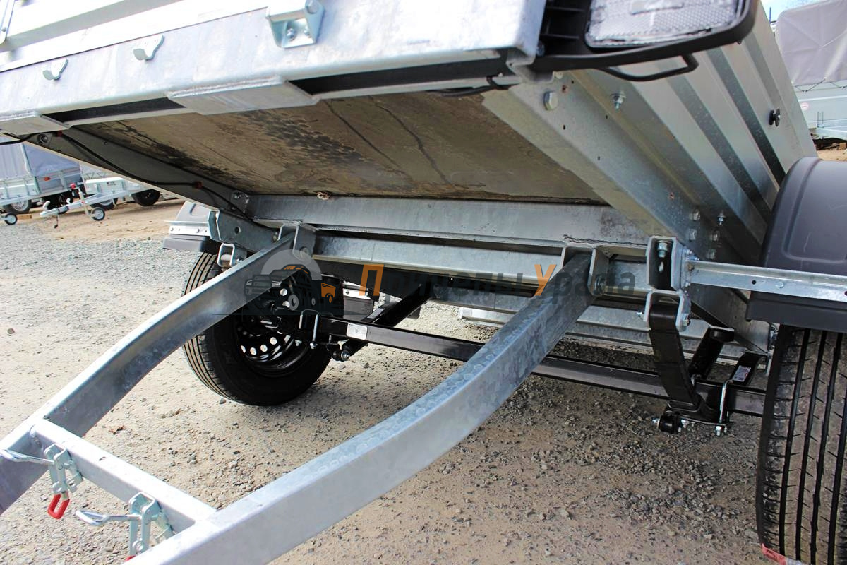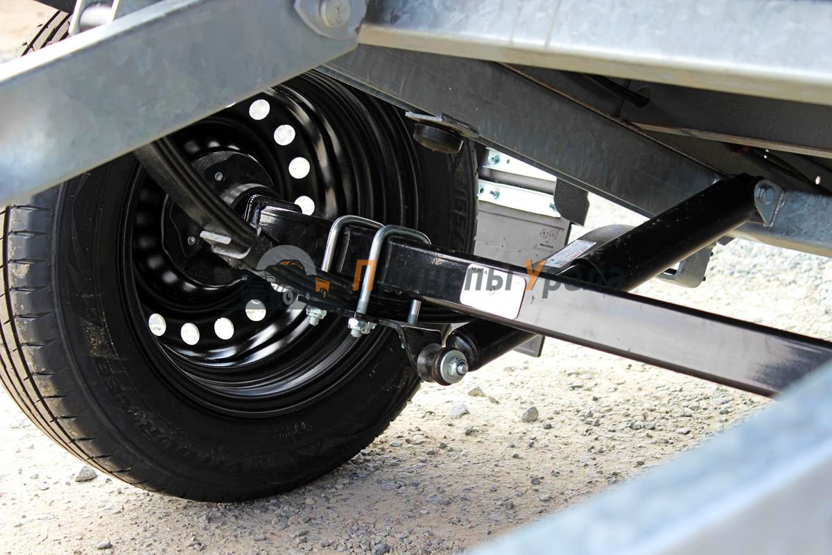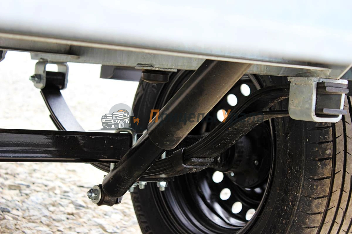 ● Рессорная подвеска (2 рессоры по 4 листа) с гидравлическими амортизаторами сохраняет стабильную плавность хода при разной загруженности прицепа.