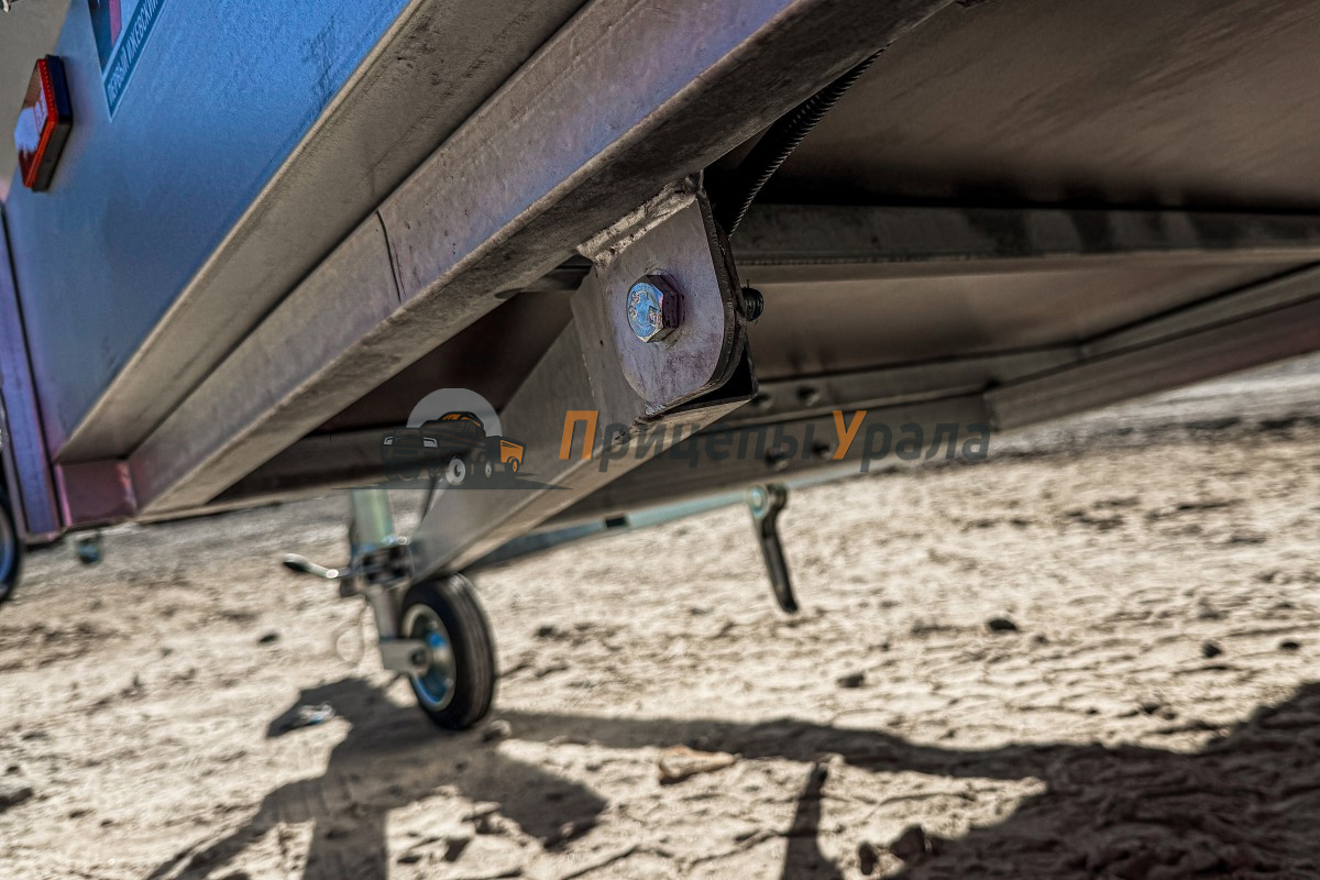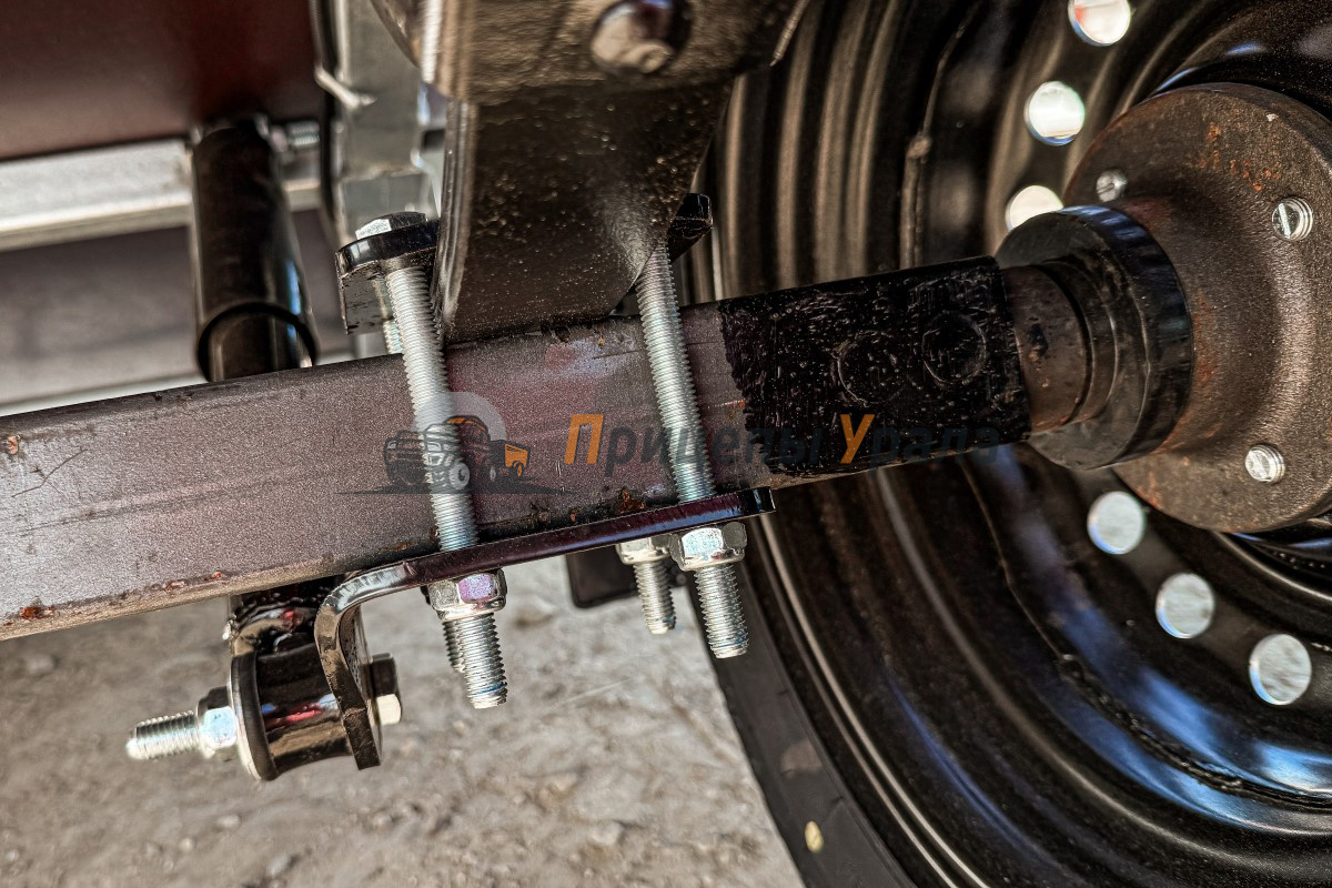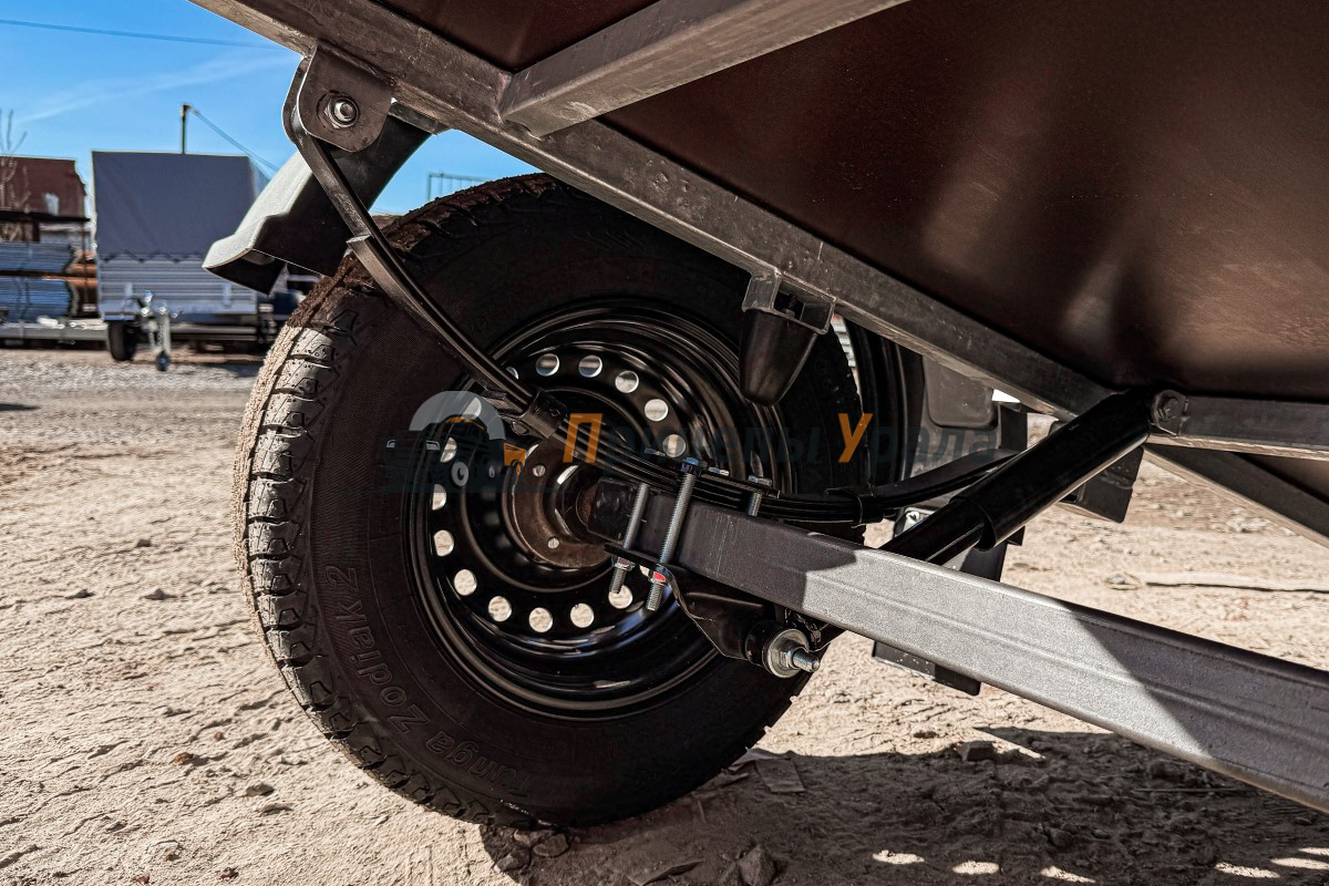 Рессорная подвеска (3 листа) с гидравлическими амортизаторами сохраняет стабильную плавность хода при разной загруженности прицепа. Ось сварная в сборе со ступицей из профиля 50х50х3 мм окрашена порошковой краской. Ось рассчитана на нагрузку 750 кг, ступицы оборудованы защитными колпаками, подшипники не требуют дополнительной смазки и регулировки на протяжении всего срока службы.