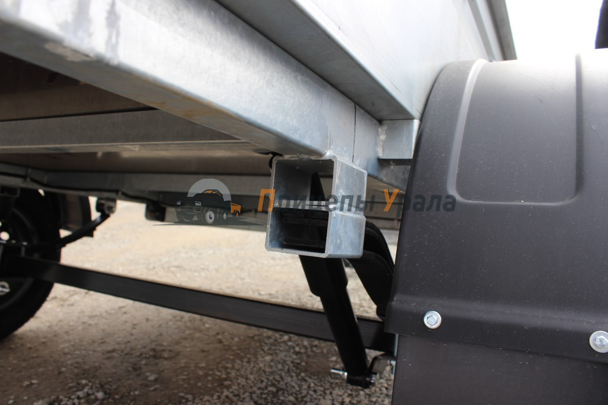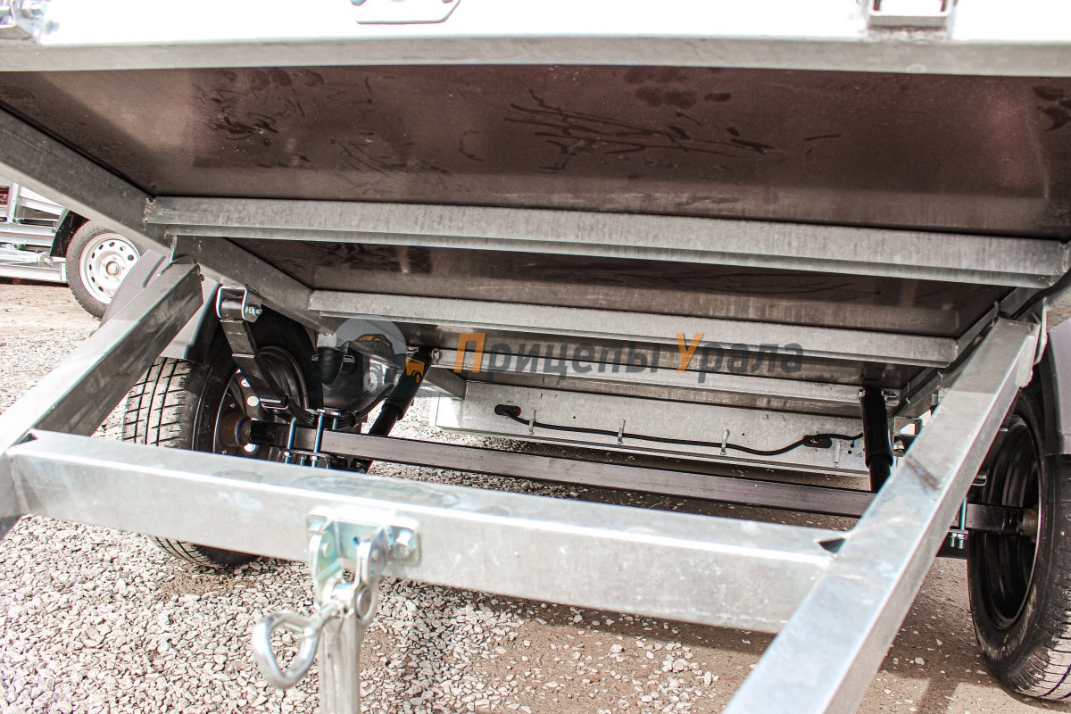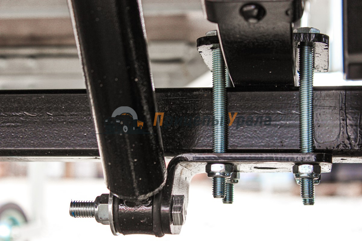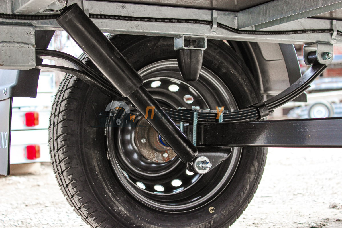 Рессорная подвеска (4 листа) с гидравлическими амортизаторами сохраняет стабильную плавность хода при разной загруженности прицепа. Ось сварная в сборе со ступицей из профиля 50х50х4 мм. Ось рассчитана на нагрузку 750 кг, ступицы оборудованы защитными колпаками, подшипники не требуют дополнительной смазки и регулировки на протяжении всего срока службы.