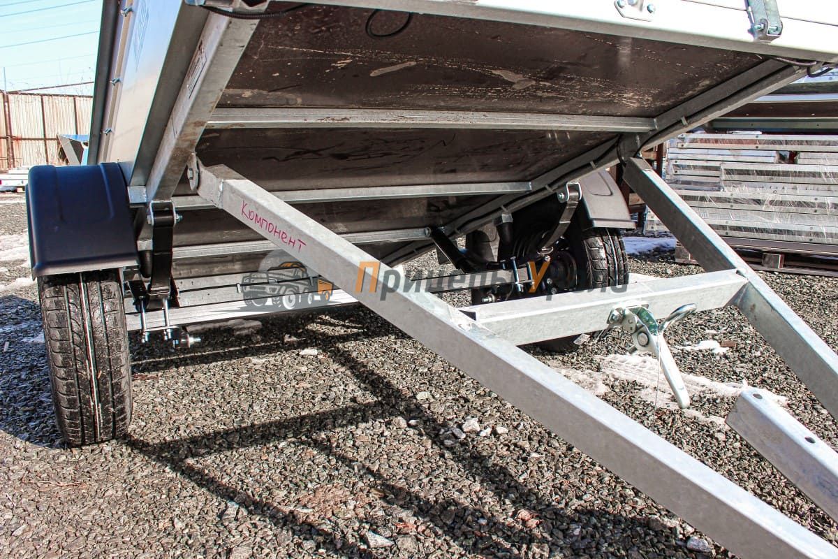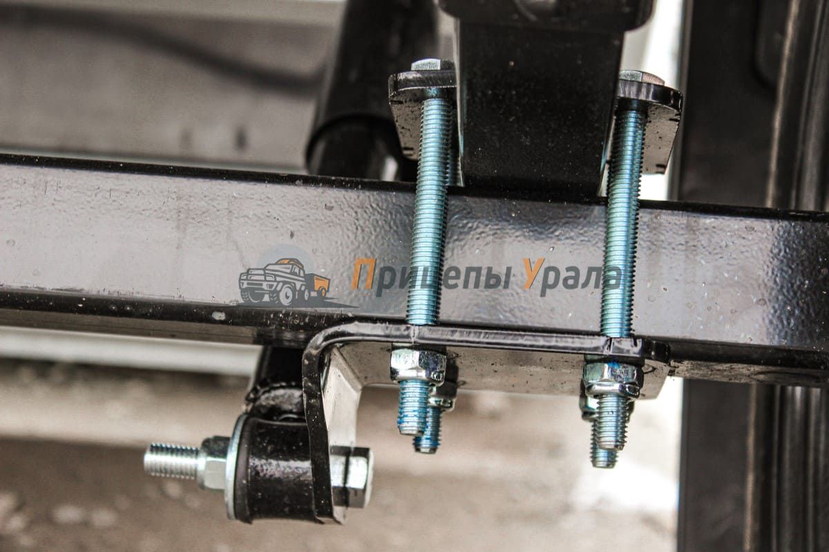 Рессорная подвеска (4 листа) с гидравлическими амортизаторами сохраняет стабильную плавность хода при разной загруженности прицепа. Ось сварная в сборе со ступицей из профиля 50х50х4 мм. Ось рассчитана на нагрузку 750 кг, ступицы оборудованы защитными колпаками, подшипники не требуют дополнительной смазки и регулировки на протяжении всего срока службы.