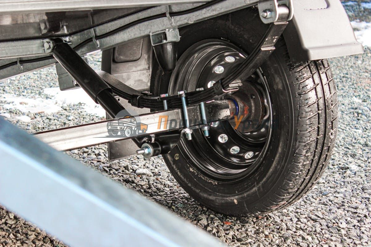 Рессорная подвеска (4 листа) с гидравлическими амортизаторами сохраняет стабильную плавность хода при разной загруженности прицепа. Ось сварная в сборе со ступицей из профиля 50х50х4 мм. Ось рассчитана на нагрузку 750 кг, ступицы оборудованы защитными колпаками, подшипники не требуют дополнительной смазки и регулировки на протяжении всего срока службы.