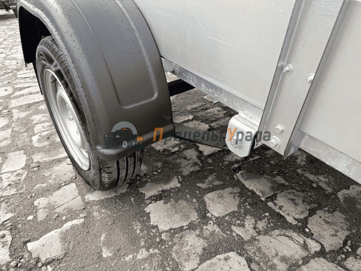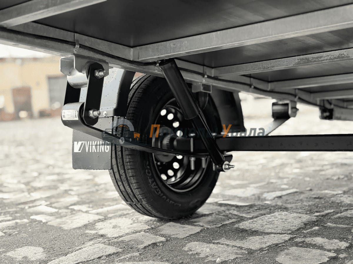 Рессорная подвеска (4 листа) с гидравлическими амортизаторами сохраняет стабильную плавность хода при разной загруженности прицепа. Ось сварная в сборе со ступицей из профиля 50х50х4 мм. Ось рассчитана на нагрузку 750 кг, ступицы оборудованы защитными колпаками, подшипники не требуют дополнительной смазки и регулировки на протяжении всего срока службы.